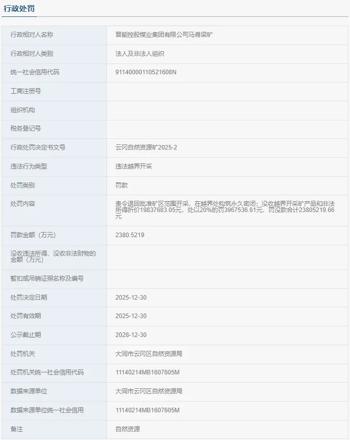 >罚款2380.5219万!大同又一煤矿越界开采被罚...