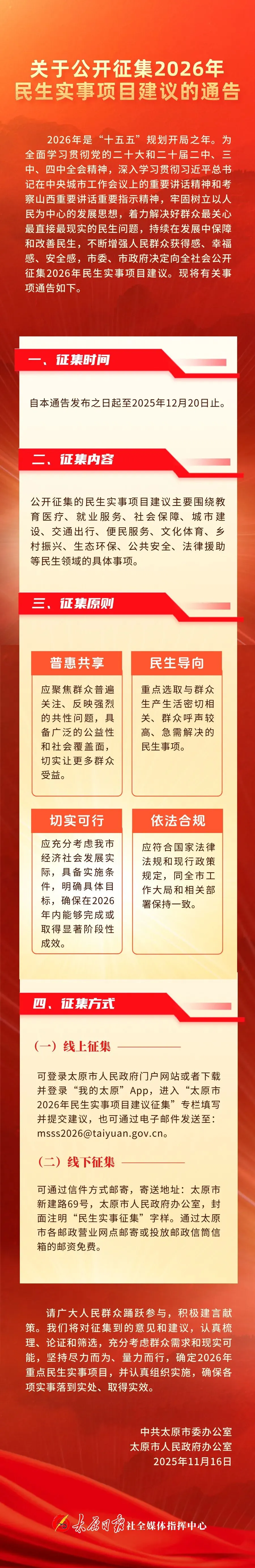(一)线上征集。可登录太原市人民政府门户网站或者下载并登录“我的太原”App,进入“太原市2026年民生实事项目建议征集”专栏填写并提交建议,也可通过电子邮件发送至:msss2026@taiyuan.gov.cn。