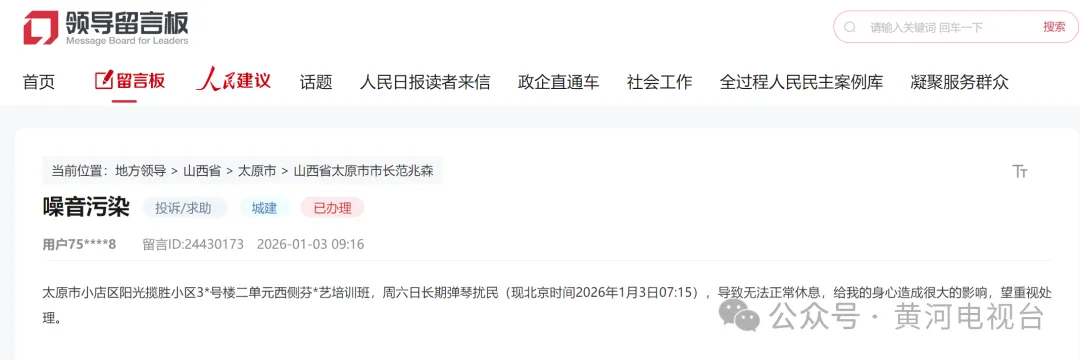 记者从人民网领导留言板获悉,网友反映太原市小店区阳光揽胜小区附近某培训班,周六日长期弹琴扰民。