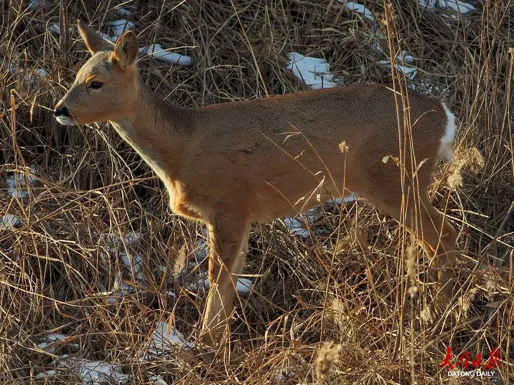 国家“三有”(有重要生态、科学、社会价值的陆生野生动物)保护动物狍子裹着厚实的黄褐色皮毛,臀尖白斑在雪地中若隐若现,偶尔驻足张望,尽显温顺憨态。