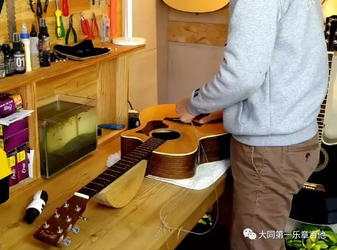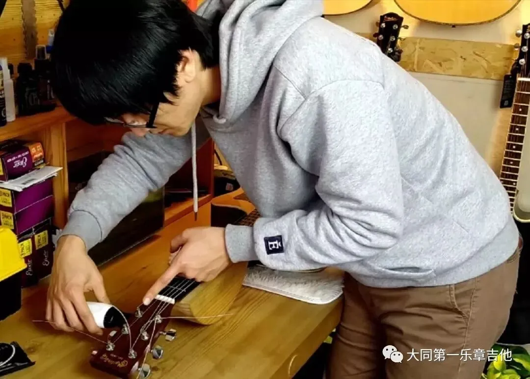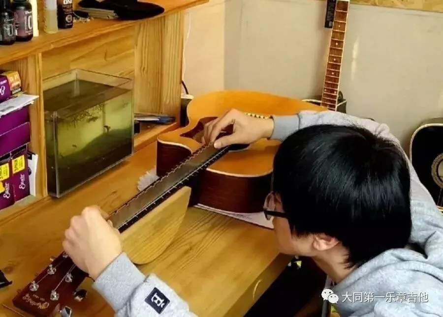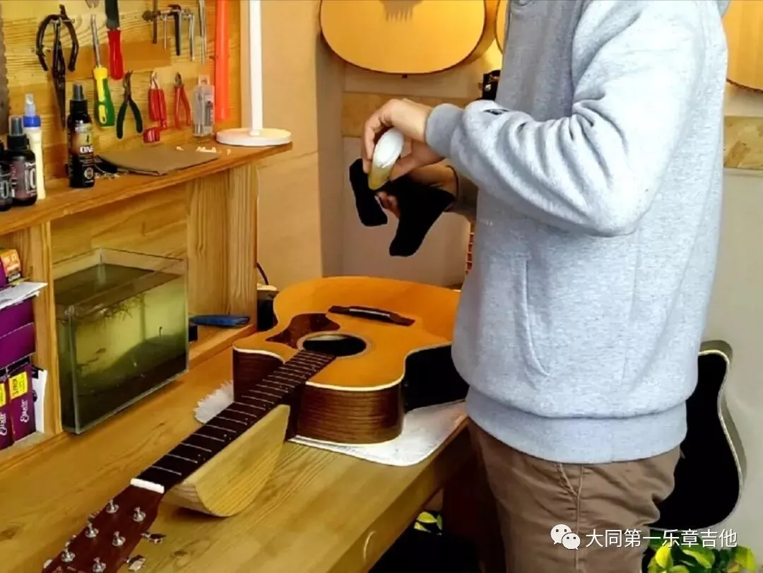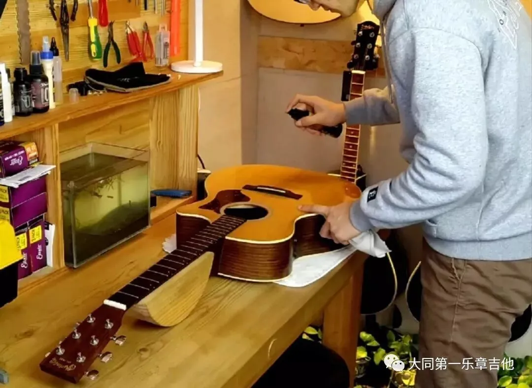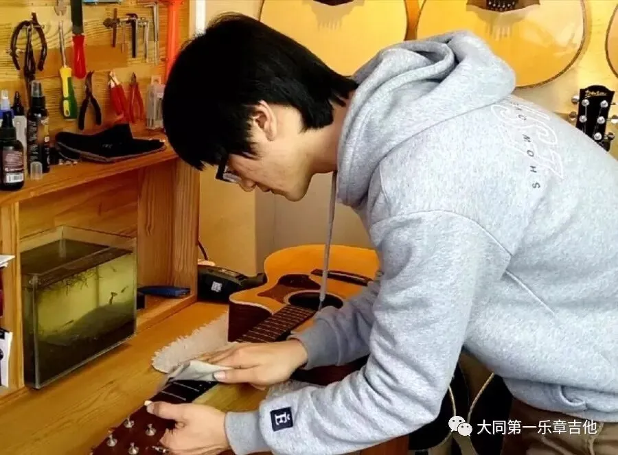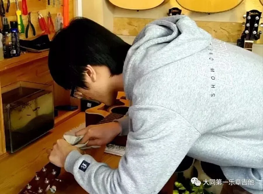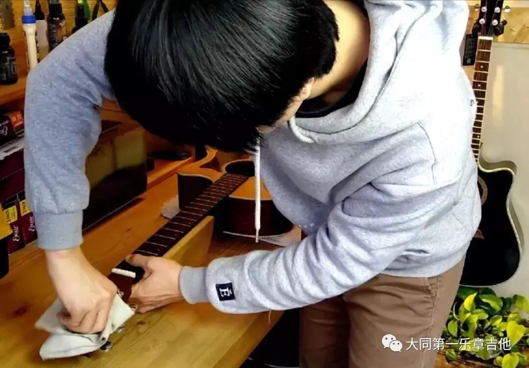 1、调整琴颈的弯曲度:气温的变化会影响到吉他的木材,如果琴发干的话,琴颈会向后弯曲,会出现打品的情况。教室会根据每把琴的情况,进行微调,达到一个良好的弹琴体验!2、清洁或更换琴弦:琴弦长时间使用会很快藏污纳垢和生锈,随着时间越长音色越差,不同品质琴弦寿命略有区别,大多一到三个月正常使用寿命。在平时使用中经常养护和清洁有助于延长使用时间。3、清洁指板品丝:日积月累的练习以后,指板和品丝上会有一些污垢,会影响自己弹琴的感觉和琴的美感。用指板去污液对吉他指板进行清洁与护理,用棕榈油对品丝进行抛光除氧化处理, 让您的爱琴焕然一新!4、清洁面板:吉他使用过后,会在面板或背板留下手印,汗渍。尤其在亮面的吉他上更为明显,久而久之影响琴的美感。教室会用上光上蜡的清洁液对吉他的面、背板进行全面彻底的清洁!5、全面上油:使用美国进口乐器护理油,无硅油配方,为吉他的全身进行养护,对指板,和琴码有非常好的滋润,防止开裂作用。对琴身和琴颈的漆面有养护作用。