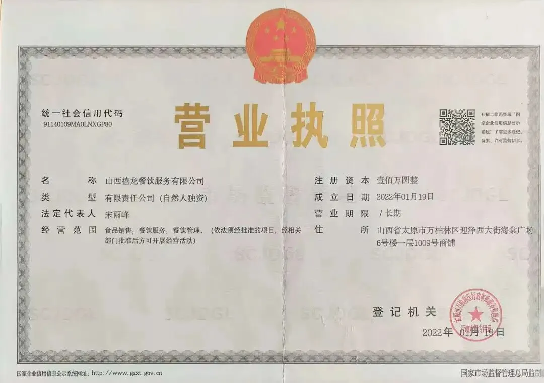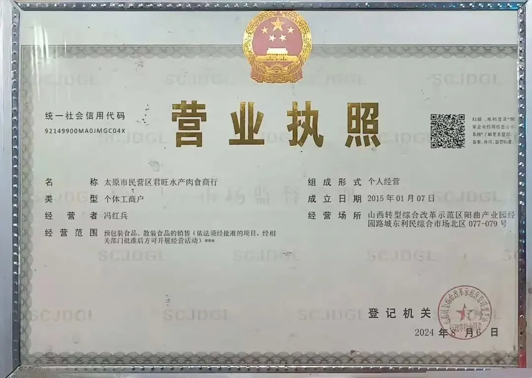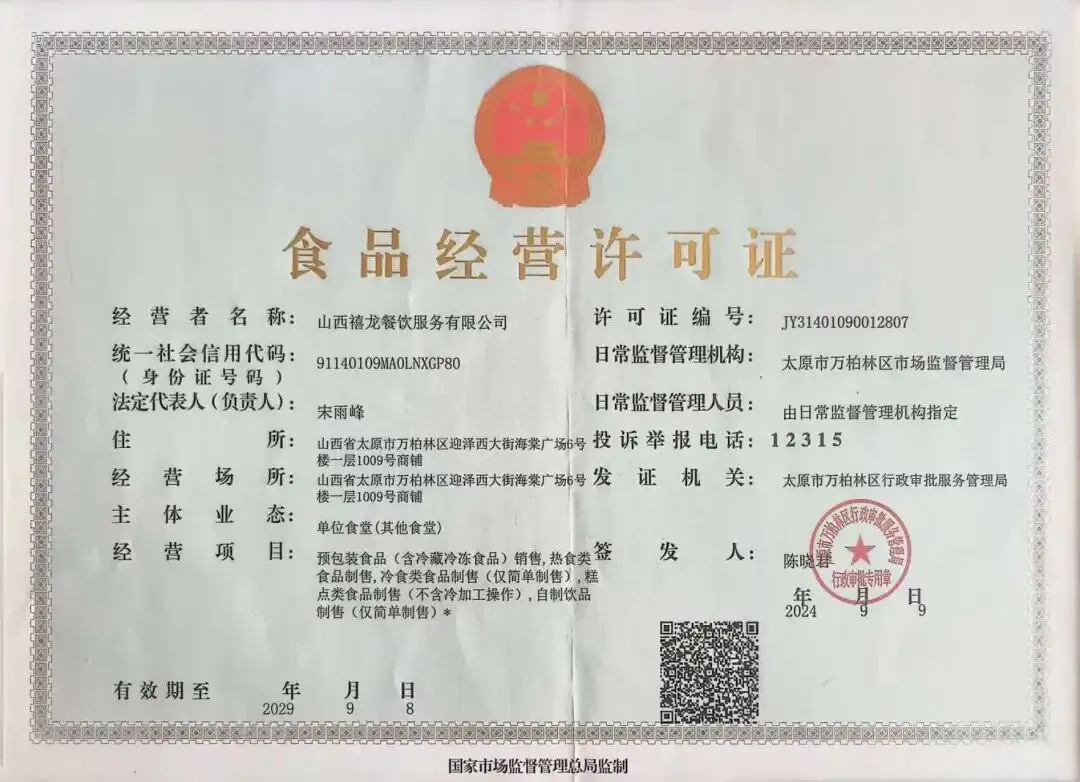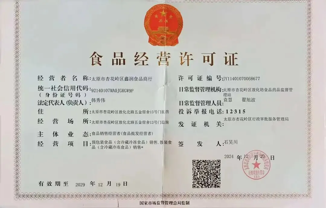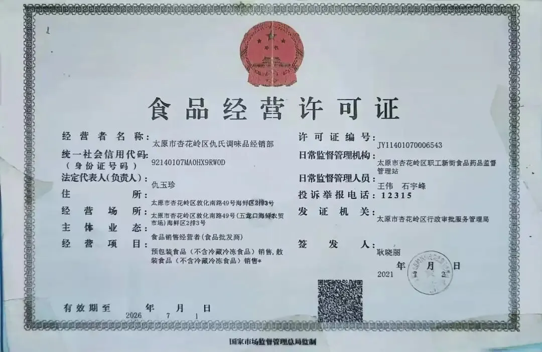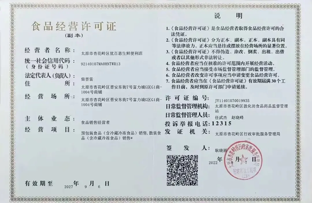 食材供应商营业执照、食品经营许可证