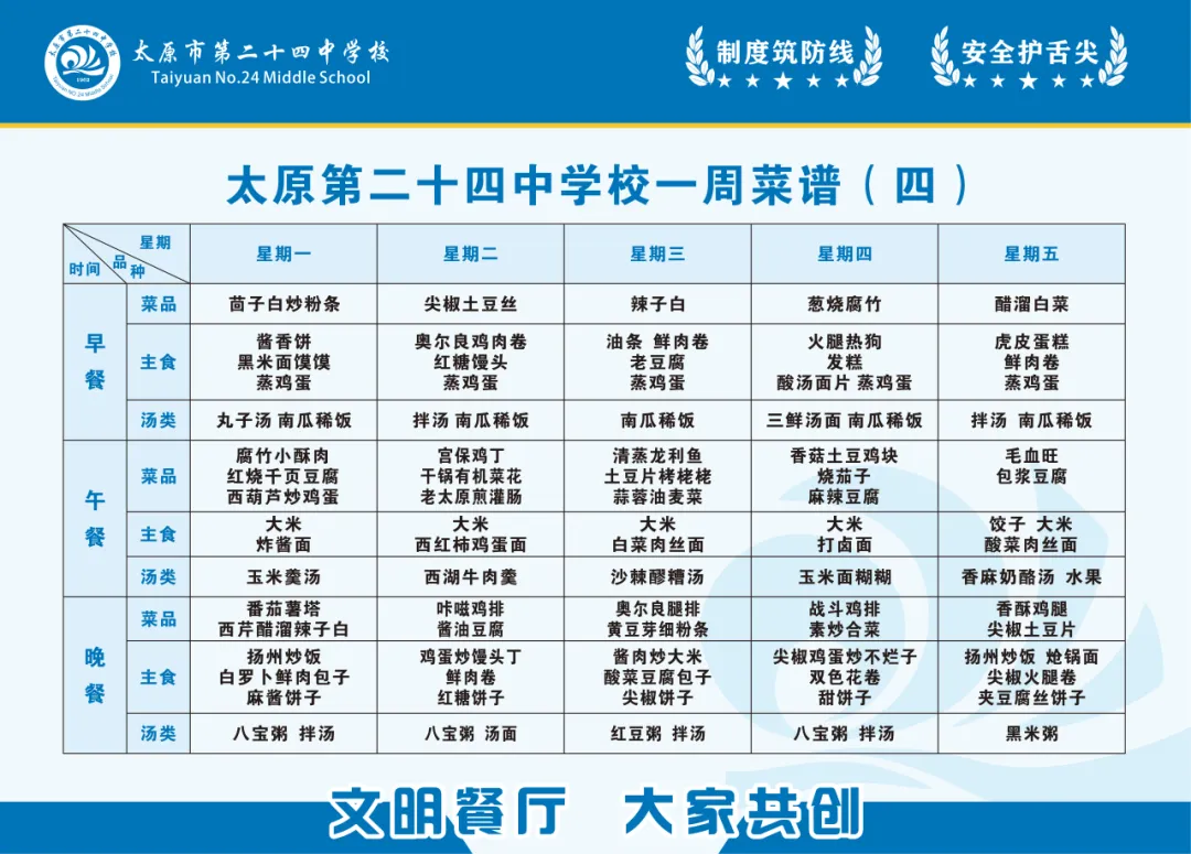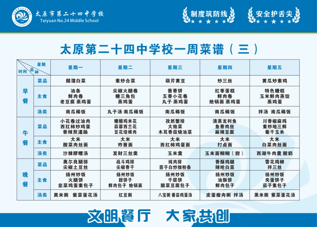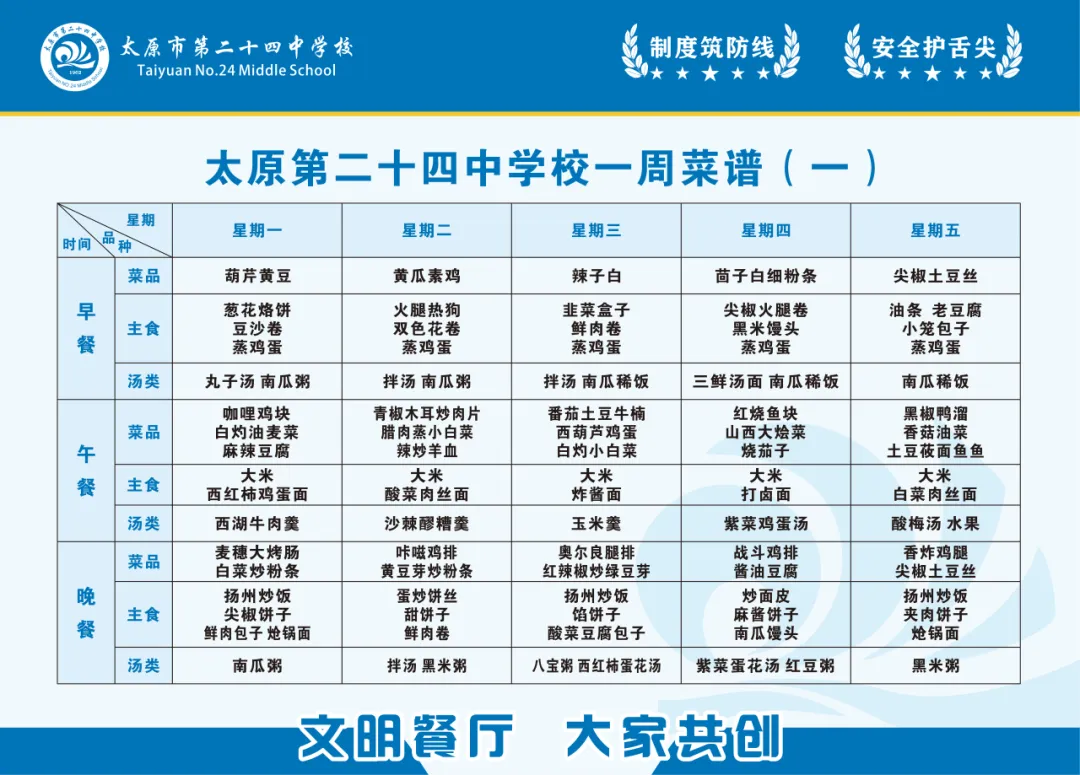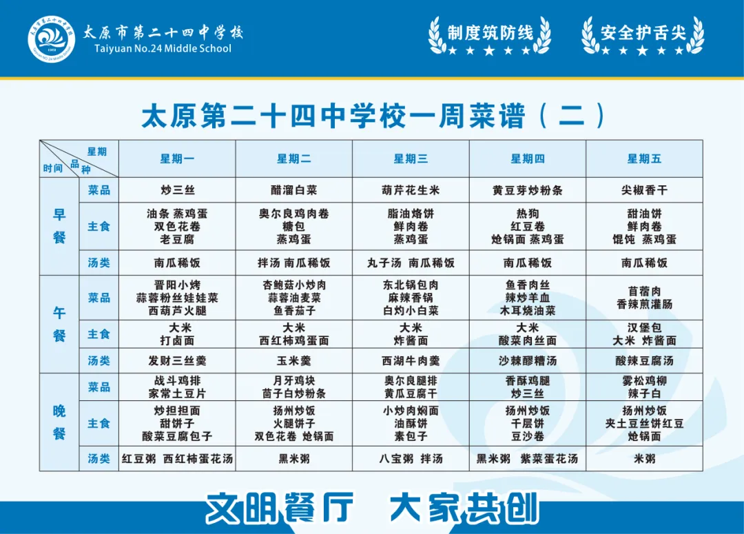 为坚守校园食品安全底线、守护师生饮食健康与营养均衡,我校特将“校园餐”相关信息全面公示。内容涵盖食堂及食材供应商资质证照、主要食材品牌与检验报告、每周食谱、师生意见及建议等。诚邀社会各界与师生家长共同监督,携手筑牢校园饮食安全坚固防线,共护师生舌尖上的安全。