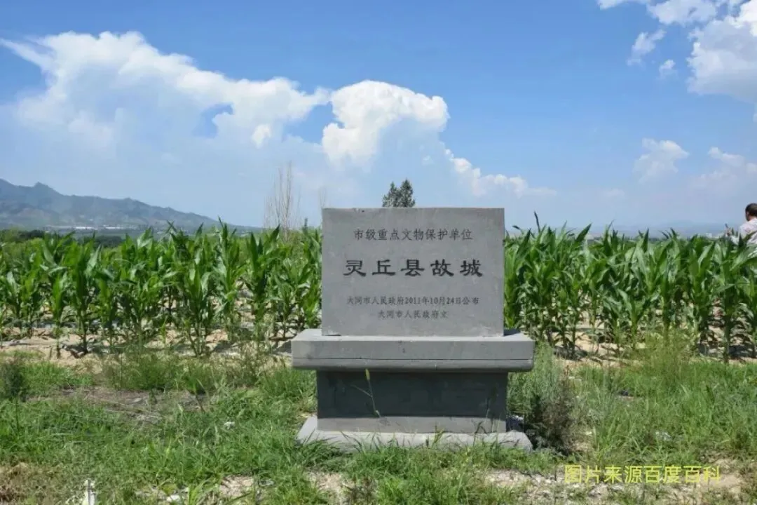 5、 汉代时期:①.灵丘县故城,俗称昭格城、赵国城,当年为赵国一城邑,位于灵丘县落水河乡新庄村北,2021年8月5日,被山西省人民政府公布为第六批省级文物保护单位,面积约110万平方米。唐朝开元年间毁于水患,西侧墙体残存遗迹已变为河床,北侧、东侧墙体保存较好。当时城内有“东城”“西城”“南城”“北城”“南城门”“北城门”,至今当地群众仍有流传该称呼。同时还留有当时“王权地”、“棋盘地”等小地名称呼,考古人员推测其为宫殿区、生活区。故城地表遍布绳纹、布纹陶片,它们是赵文化及先秦文化的重要见证。②.曹窑遗址,位于广灵县