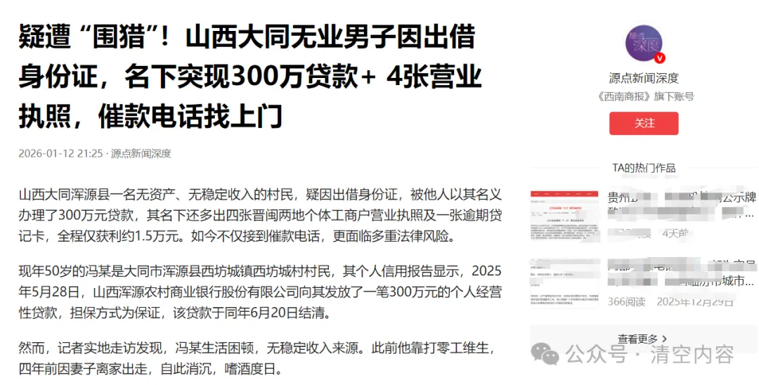 山西大同浑源县一名无资产、无稳定收入的村民,疑因出借身份证,被他人以其名义办理了300万元贷款,其名下还多出四张晋闽两地个体工商户营业执照及一张逾期贷记卡,全程仅获利约1.5万元。如今不仅接到催款电话,更面临多重法律风险。