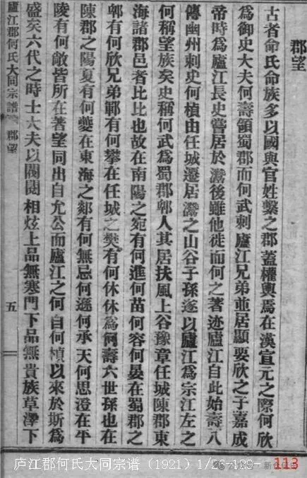 页面113郡望古者命氏族多以國與官姓繫之郡,蓋權輿焉。在漢宣元之際,何欣為御史大夫,何壽領蜀郡,而何武刺廬江。兄弟居顯,欣之子嘉成為御史,廬江長史營居於濉溪,後徙他之,著述廬江,自此始。裔八傳,幽州刺史何楨由任城遷居潛之山谷子孫,遂以廬江為宗。左之何,稱望族矣。更稱何武為蜀郡郫人,其居鳳上谷、豫章、任城、陳郡、東海諸郡邑者,比比也。故在南陽之宛有何進、何苗,容何晏;在蜀郡之郫有何況,兄弟鄶有何攀;在任城之樊有何休;壽六世孫也,在陳郡之陽夏有何夔;在東海之郯有何無忌,何承天;何思澄在平陵,有何敬容所。在著望,同出自允公,而廬江之何,自何信以來,於斯為盛矣。六代之時,士大夫以閥閱相炫,上品無寒門,下品無貴族,草澤下廬江郡何氏大同宗譜〡郡望五廬江郡何氏大同宗譜(1921)1/26-129-113