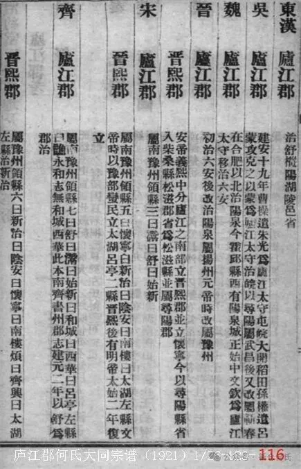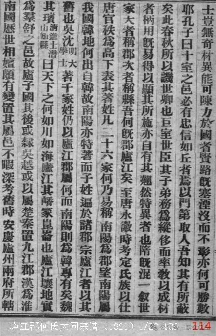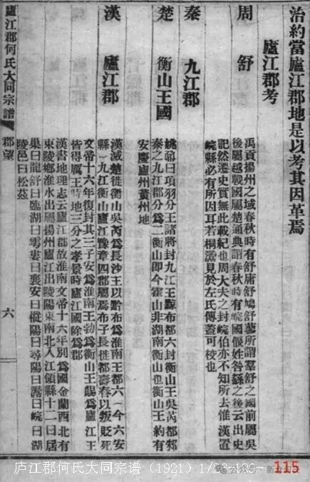页面114士豈無奇才異能可陳力於國者,賢路既壅,沒而不彰,亦何可勝數。孔子曰:十室之邑,必有忠信如丘者焉。以門第取人,吾知其有所蔽矣。此春秋所以譏世卿也。巨室世臣,其子弟務侈修,而率教以成材者稀。用既易得以顯其施,亦自有其翹然特異者也。隋既混一,敘世大家者,稱郡次者,稱縣吾何,既郡廬江矣。至唐永徽時,考定氏族,以仕唐官秩為高下,表其著姓,凡二十六家,何乃易稱南陽郡。望南陽國,我國蟬地,何出自韓,故韓亦特著。而子姓遍於諸郡,宗廬江者以舊譜也。吳沈明大著千家姓,仍以廬江郡屬何,而南陽則專有事矣。魂其璜,湘進士淸一山知解,曰:天下之何,如川如海,廬江其嶰家崑崙也,廬江壤地,實為羣何之祖。故廬子國其後,或隸吳越,或以屬楚,秦置九江郡,漢為淮國,歷世相嬗,頗有變置。其屬邑不暇深考,時安慶府州南府所轄廬江郡何氏大同宗譜〡郡望