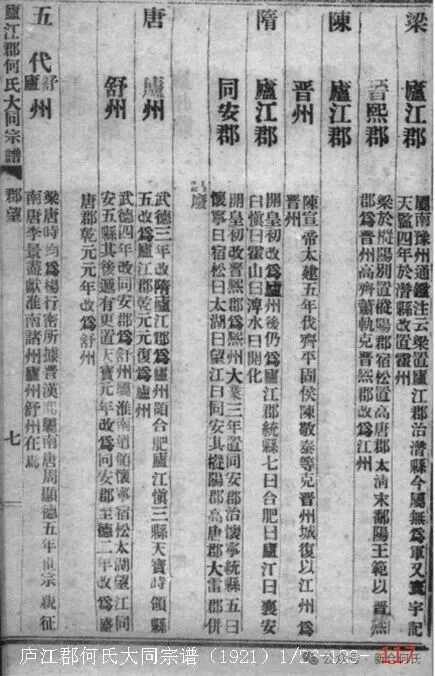 页面117梁 晉熙郡置豫州,治懷寧,注云:梁置豫州,廬江郡治潛,今屬無為,軍又新字記。天監四年,於潛縣置安城郡,改屬。梁於皖城置晉州,晉熙郡,尋省,晉州,改為高塘,太守,鄱陽王範以譙淹都督,晉州,高塘,晉熙,龍亢,郟,松滋,郡。陳 晉州陳宣帝太建五年,伐齊,平陳,敗秦敵,等置晉州,城復以江州,為晉州。隋 廬江郡開皇初,改晉州,後仍為廬江郡,縣七:曰合肥,曰廬江,曰襄安,曰慎,曰霍山,曰灊,曰水,曰開化。開皇初,改晉熙郡,州,大業三年,置同安郡,治懷寧,統縣五:曰懷寧,曰宿松,曰太湖,曰望江,曰同安,其龍關,郡,大唐郡,都,郡。唐 廬州武德三年,改隋,廬江郡為廬州,領合肥、廬江、慎三縣,天寶,領縣。武德三年,改隋,同安郡為安慶州,尋改為舒州,領懷寧、宿松、太湖、望江、同安五縣,其後廢,有更置,天寶元年,改為同安郡,至德二載,改為盛唐郡,乾元元年,改為舒州。五代 舒州唐時,均為楊行密所據,晉書,漢書,周顯德五年,世宗征淮南,唐李景盡獻淮南,諸州,廬州,舒州,在焉。廬江郡何氏大同宗譜〡郡望七