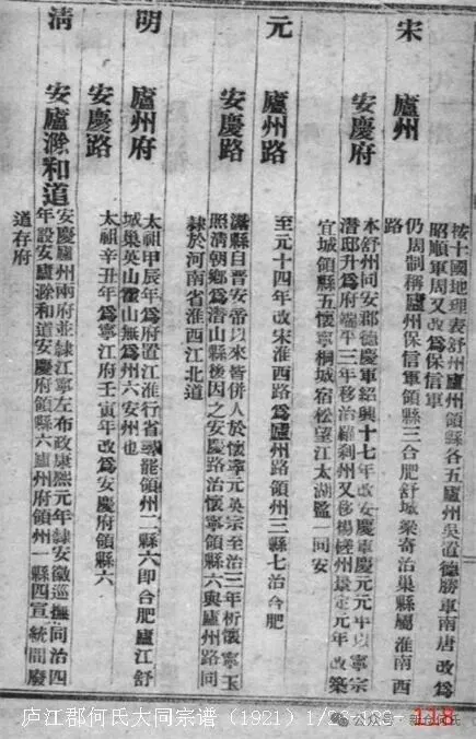 页面118宋 廬州按十國地理表,舒州廬州,領縣各五,廬州,吳置,德勝軍,南唐改為保信軍,仍制,稱廬州,保信軍,領縣三:合肥、廬江、梁希,治巢縣,屬淮南。安慶府本舒州,同安郡,德慶軍,經興十二年,改安慶軍,慶元元年,以寧宗潛邸,升為安慶府,端平三年,徙治蘄州,又移德祐,復徙,景定元年,改築宜城,御五懷寧,桐城,宿松,望江,太湖,縣一同安。元 廬州路至元十四年,改宋淮西,廬州路,領州三,縣三:合肥。安慶路潛山縣自唐以來,皆併入,於懷寧,元英宗至治三年,析懷寧,玉照,潛規,皖潛山,縣,因以元之安慶路,領縣六:興慶,廬州路,同隸於河南,江北道。明 廬州府太祖甲辰年,改廬江,省,隸行省,尋領州二,縣六:合肥、廬江、舒城、巢、無為、六安州,也,英山、霍山,隸六安州,也。安慶府太祖辛丑年,改為江淮,壬寅年,改為安慶府,領縣六。清 安慶潛和道安慶府,州,府,並隸,江寧,布政,康熙元年,隸安徽,撫,同治四年,置安慶,潛和道,安慶府,廬州府,六安直隸州,州所屬州縣,並轄,治共隸於安徽省,長。廬江郡何氏大同宗譜〡郡望