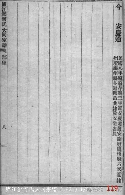 页面119今 安慶道民國元年,廢府存縣,三平置安慶道,轄安慶府,廬州府,六安直隸州所屬州縣,並轄,治共隸於安徽省,長。廬江郡何氏大同宗譜〡郡望庐江郡何氏大同宗谱·郡望(白话文)一 古代给氏族命名,大多会和封国、官职挂钩,再把姓氏和对应的郡望联系起来,这种做法大概就是从那个时候开始的。 在汉宣帝、汉元帝在位期间,何欣担任御史大夫,何寿治理蜀郡,何武则出任庐江刺史。兄弟几人都身居高位,何欣的儿子何嘉成也当上了御史,还在庐江担任长史,在濉溪安家居住,后来又迁徙到了别的地方。庐江何氏的相关著述,就是从这个时候开始的。 传了八代之后,幽州刺史何桢从任城迁居到潜山谷地,他的子孙后代便把庐江当作了宗族的发源地。因此,左地的何氏,成了名门望族。 史料又记载何武是蜀郡郫县人,除此之外,在上谷、豫章、任城、陈郡、东海等郡县,也都有何氏族人聚居。比如南阳宛县有何进、何苗和何晏;蜀郡郫县有何况兄弟,鄶地有何攀;任城樊地有何休,他是何寿的六世孙;陈郡阳夏有何夔;东海郯地有何无忌、何承天;平陵有何思澄、何敬容。 这些地方的何氏望族,都源自何允公一脉,而庐江何氏从何信这一代起,发展得格外兴盛。 六朝时期,士大夫们常常炫耀自家的门第家世,当时的选官制度讲究“上品无寒门,下品无贵族”,民间的有才之士就算有治国安邦的才干,也会因为出身贫寒而仕途受阻,最终被埋没的人多得数不清。 孔子说过:“就算是只有十户人家的小地方,也一定有像我这样讲忠信的人。”仅凭门第来选拔人才,可想而知会有多大的局限。这也是《春秋》这部典籍会讥讽世袭卿相制度的原因。 那些世家大族的子弟,大多追求奢侈享受,能遵从教诲成才的人少之又少。不过,这类人凭借出身轻易获得官位,其中也确实有才华出众的人。 隋朝统一天下后,记录世家大族时,会先标注郡名,再标注县名。我们何氏的郡望,原本是庐江郡。到了唐朝永徽年间,朝廷评定氏族等级,依据族人在唐朝做官的品级高低来划分门第,选定了二十六个望族,何氏的郡望却被改成了南阳郡。 南阳是古代的一个封国,我们何氏源自韩国,所以韩氏也算得上是名门望族,而何氏子孙遍布各个郡县,后世何氏尊奉庐江为郡望,是依据老族谱的记载。 明代吴沈编纂的《千家姓》里,仍然把庐江郡列为何氏的郡望,而南阳郡则另有对应的姓氏。 湘地的进士一清山对此解读道:“天下的何氏族人,就像江河湖海一样遍布各地,庐江郡就如同江河的源头昆仑山,是天下何氏的发源地。” 庐江的地域范围,在历史上不断变化,它的前身是庐子国,后来有的区域划归吴越,有的区域归属楚国。秦朝时这里设置九江郡,汉朝时改为淮国,历经各个朝代的更迭,行政区划有过很多次调整,下属的县邑就不一一详细考证了。当时安庆府南部管辖的区域,大致就是古时候庐江郡的范围,所以在这里考证一下它的历史沿革。二周朝·舒地 这片区域在《尚书·禹贡》里属于扬州,春秋时期有舒庸、舒鳶等部族,被统称为“群舒”。这里先归吴国管辖,后来又属于越国,最终被楚国吞并。 古籍和《春秋》里记载过不少小诸侯国,都是偃姓部族建立的,据说这些部族是史官史嚚的后代,这种说法肯定有依据。像桐国这样的小国,在《左传》里有明确记载,还能考证相关事迹,其他一些小国就不知道具体来历了。秦朝·九江郡 楚国灭亡后,项羽分封各路诸侯,封黥布为九江王,都城设在六地;又封吴芮为衡山王,都城设在邾地。秦朝的九江郡,管辖范围包括后来的衡山郡一带,衡山郡就是现在的霍山地区,衡山王吴芮的管辖范围,涵盖了如今的安庆府、黄州地区。 楚汉相争时期·衡山王国汉朝·庐江郡 汉朝灭掉楚国后,把衡山王吴芮改封为长沙王,黥布则占据淮南地区,都城仍在六地。汉高祖十六年,安汉侯刘交被封为楚王,都城在彭城,九江、庐江、豫章、丹阳四个郡,都划归汉朝直接管辖。 汉文帝十六年,把淮南王刘喜改封为城阳王,又将原来的淮南国一分为三,封淮南厉王的三个儿子为王:刘安为淮南王,刘勃为衡山王,刘赐为庐江王。等到汉景帝即位后,这几个封国被撤销,重新恢复为郡县。 《汉书·地理志》记载:庐江郡原本是淮南国的一部分,汉文帝十六年单独设为诸侯国,有124383户人家,人口457333人,下辖十二个县,分别是:舒县、居巢县、龙亢县、临湖县、雩娄县、襄安县、阳泉县、寻阳县、灊县、睆县、湖陵邑、松滋县。 庐江郡的治所设在舒县,后来湖陵邑被撤销,并入了其他县。东汉·庐江郡 汉献帝建安十九年,曹操派朱光担任庐江太守,驻军皖城,大力开垦荒地,还招抚边境的百姓。之后曹操又派吕蒙进军皖城,攻占城池并生擒朱光,把庐江郡的治所迁到了寻阳。 后来吴国实力日益强盛,孙权又率军偷袭荆州,合肥以北的区域归魏国管辖,庐江郡的治所也随之调整。当时吴国的地盘里,如今霍邱县西边有一座阳泉城。三国魏齐王正始年间,文钦担任庐江太守,把郡的治所设在了六安。三国魏·庐江郡 庐江郡一开始的治所在六安,后来迁到了颍地,归扬州管辖。到了魏元帝时期,庐江郡改属豫州。晋朝·晋熙郡 晋安帝义熙年间,从庐江郡的南部划出一块区域,设置了晋熙郡,还设立了怀宁县,同时把寻阳县撤销,并入柴桑县;松滋县则划回原来的所属郡。 晋熙郡归南豫州管辖,下辖三个县:潜县、新冶县、怀宁县。南朝宋·晋熙郡 晋