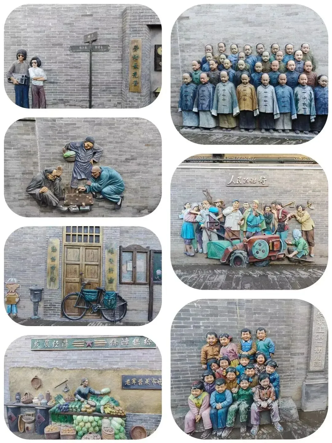 从县衙一个侧门出来,来到一条小巷子,两边墙上都是那种半浮雕画作。还有好多七八十年代的人物和场景,勾起我许多儿时的回忆。
