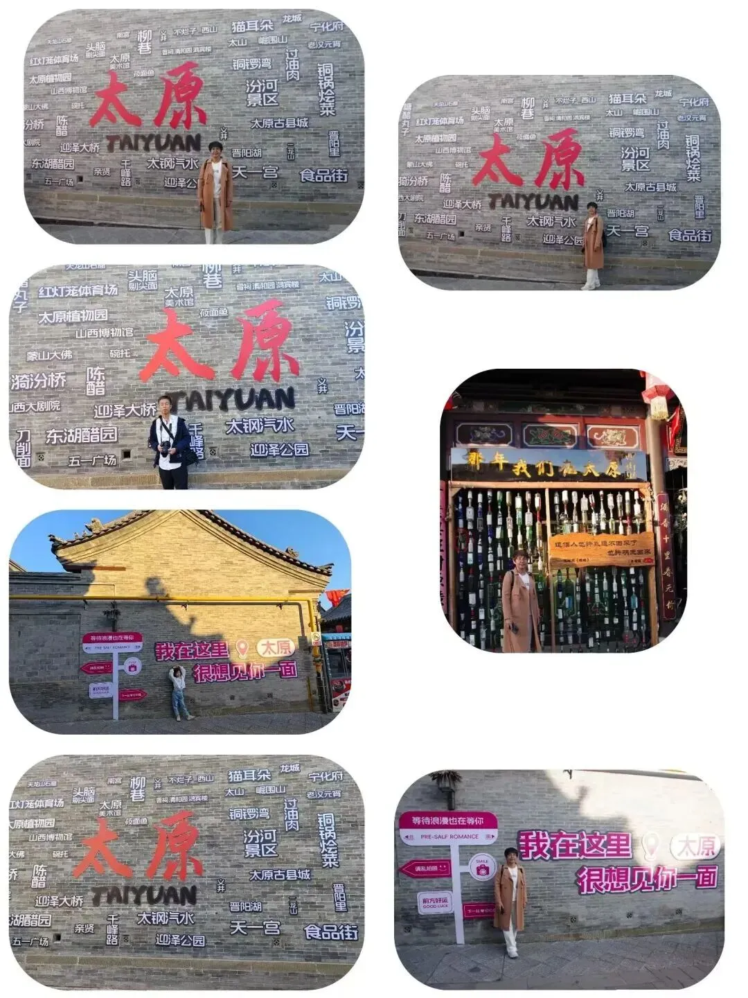 走着走着,一条胡同里出现了一面网红打卡墙。上面写满了太原的热门美食和热门打卡地,吸引了不少游客前来拍照留念。我们也凑热闹地拍了几张照片。