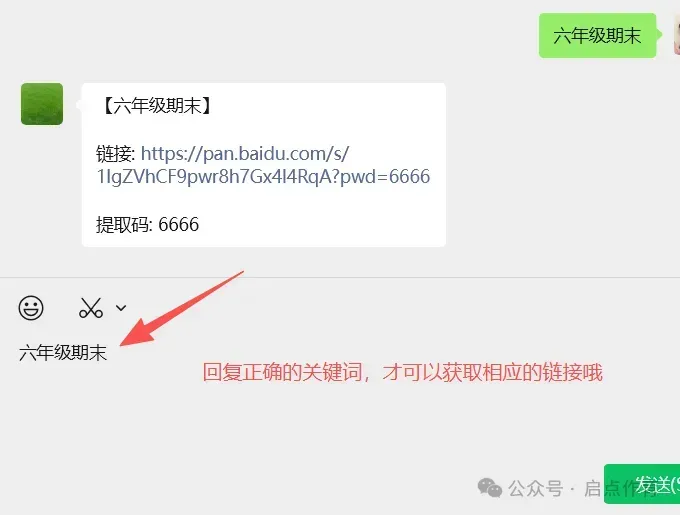 2、进入公众号对话框,回复关键词 “六年级期末”,即可自动获取下载链接(链接长期有效,可反复下载)。