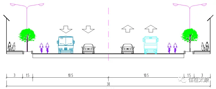 标准横断面为中间21米车行道,两侧各4.5米人行道(含1.5米树穴带)。