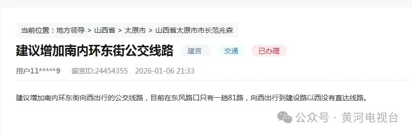 记者从人民网领导留言板获悉,网友建议增加太原市南内环东街向西出行的公交线路,目前在东风路口只有一趟81路,向西出行到建设路以西没有直达线路。