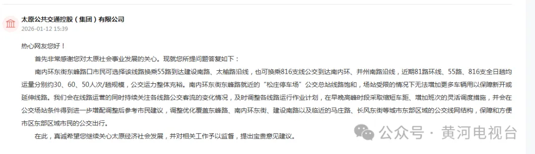 南内环东街东峰路口市民可选择该线路换乘55路到达建设南路、太榆路沿线,也可换乘816支线公交到达南内环、并州南路沿线,近期81路环线、55路、816支全日趟均运量分别约30、60、50人次/趟规模,公交运力整体充裕。南内环东街东峰路就近的“松庄停车场”公交总站线路饱和,场站受限的情况下无法增加更多车辆用以保障新开或延伸线路。我们会在线路运营的同时持续关注各线路公交客流的变化情况,及时调整各线路运行作业计划,在早晚高峰时段采取缩短车距、增加班次的灵活调度措施,并会在公交场站条件得到进一步增配调整后参考市民建议,调整优化覆盖东峰路、南内环东街、建设南路以及临近的马庄路、长风东街等城市东部区域的公交线网结构,保障和方便市区东部区域市民的公交出行。
