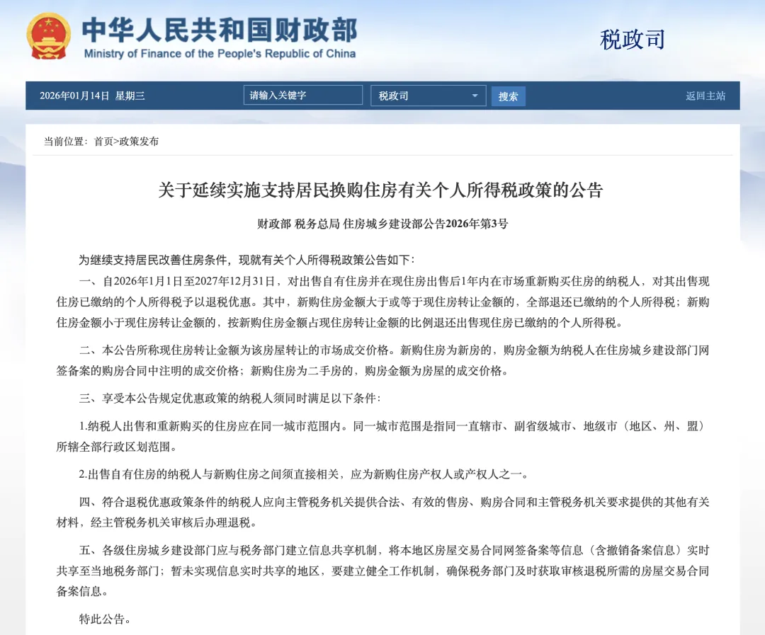 《公告》明确自2026年1月1日至2027年12月31日,对出售自有住房并在现住房出售后1年内在市场重新购买住房的纳税人,对其出售现住房已缴纳的个人所得税予以退税优惠。全文如下: