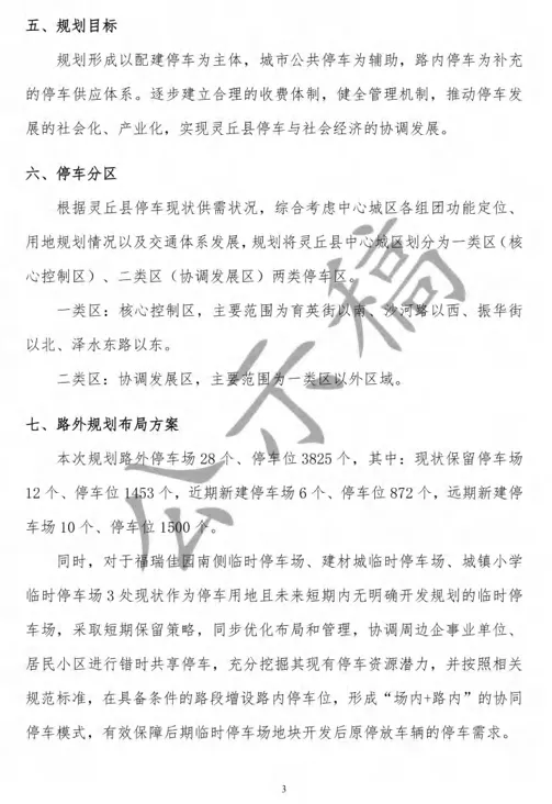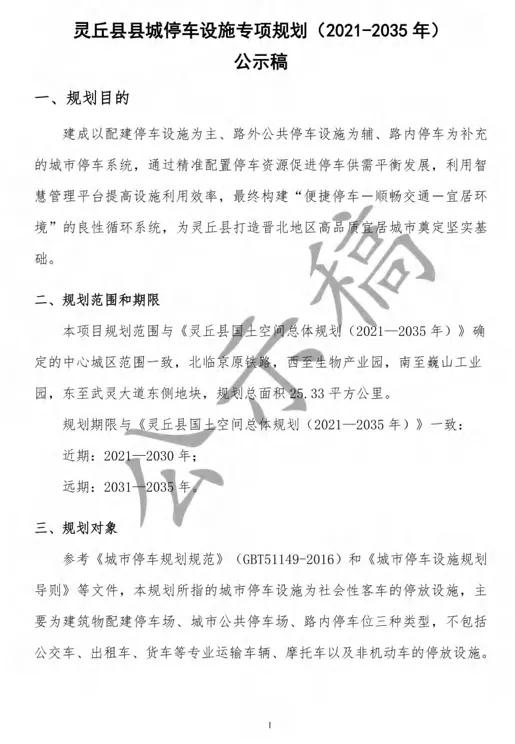 为配合《灵丘县国土空间总体规划(2021—2035年)》的顺利实施,落实国家、省、市、县关于停车管理的相关要求,科学安排灵丘县中心城区停车设施规划布局,构建有序停车环境,我局组织编制了《灵丘县县城停车设施专项规划(2021-2035年)》(以下简称《规划》)。