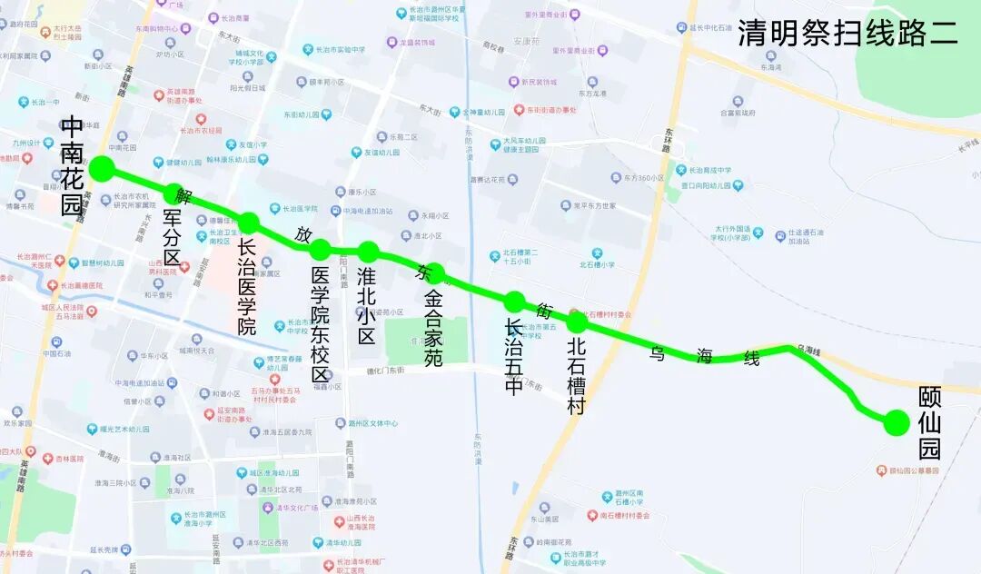 站点设置:淮海厂、延安路口五马办事处、长治十六中、淮北小区、金合家苑、长治五中、北石槽村、颐仙园公墓