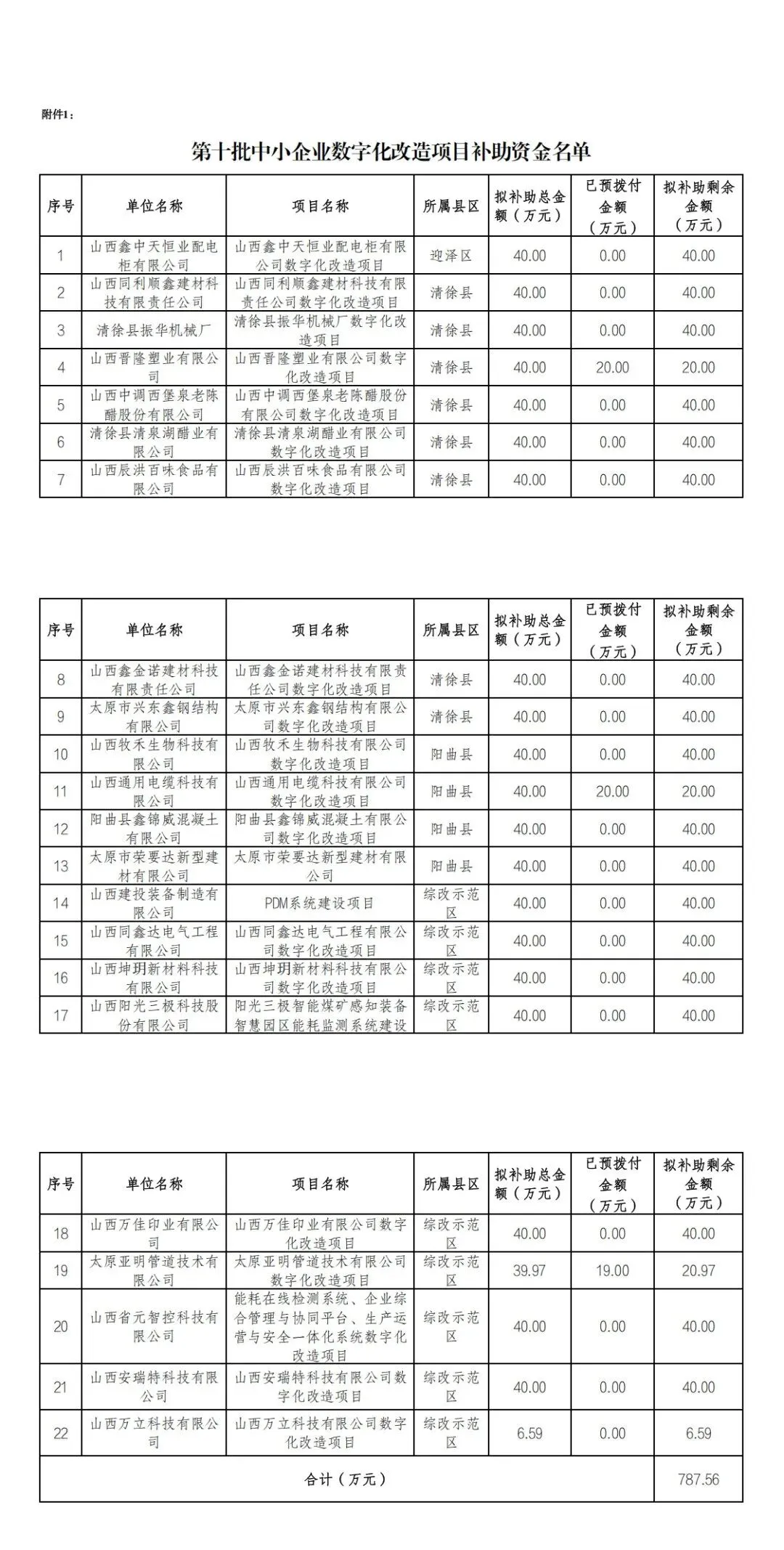 太原市工业和信息化局关于第十批中小企业数字化改造项目补助资金拨付名单的公示