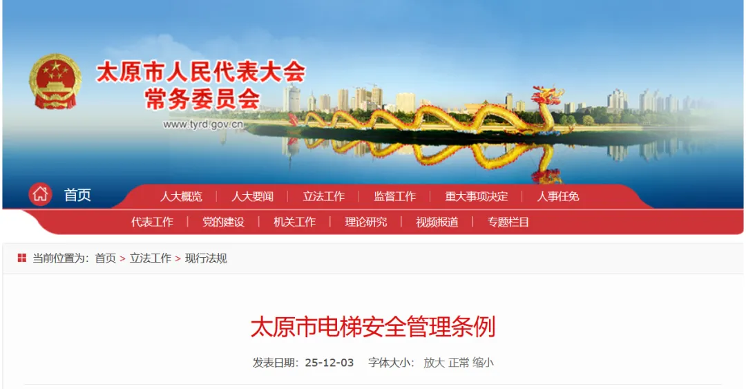 《太原市电梯安全管理条例》已由山西省第十四届人民代表大会常务委员会第二十五次会议于2025年11月26日批准,现予公布,自2026年5月1日起施行。