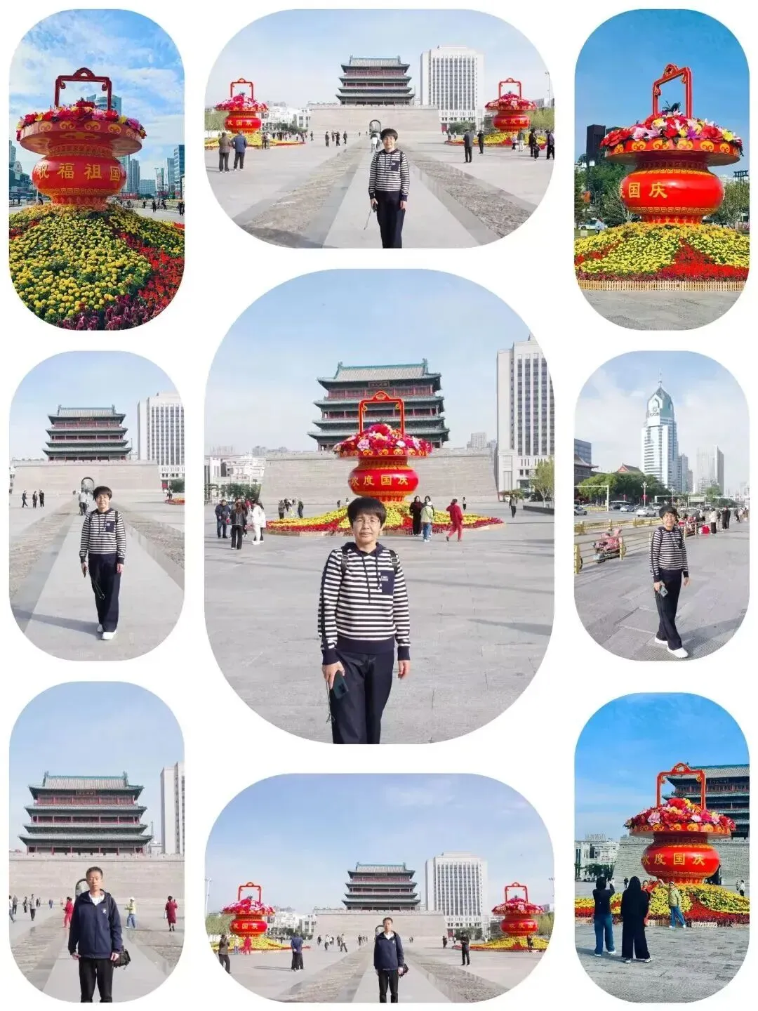 走进五一广场,两座红彤彤的巨型花篮霸气地占据了广场 C 位,花篮上 “祝福祖国,欢度国庆” 的金色大字格外醒目,周围簇拥着缤纷鲜花,赏心悦目。花篮周围挤满了游人,大家都举着手机拍个不停。我俩也加入打卡的行列,享受国庆带来的热闹与快乐。