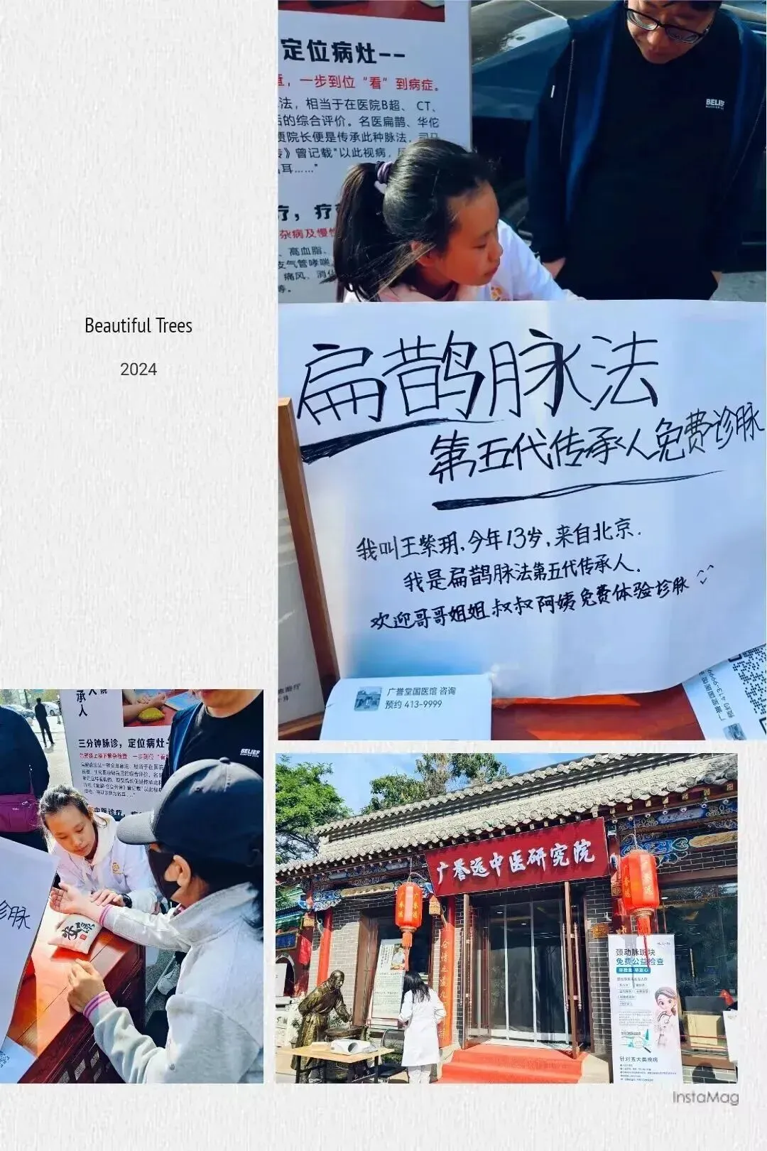 在一个名为 “广誉远中医研究院” 的门口,一群人簇拥在一起,引起了我的好奇。凑近一看,竟是一位年仅 13 岁的小姑娘正在为人们诊脉。看她把脉问诊的模样,竟透着几分靠谱。一打听,只需简单添加微信,就能享受到免费的义诊服务。看排队的人不多,反正又不要钱,我们便加入了等待的队伍。十多分钟就轮到我们了,只见小姑娘轻轻把手搭在我们的手腕上,一边号脉一边准确说出我们身体的小状况。还好,都是些这个年龄段常见的小毛病,但也给我们提了个醒 :往后要更加关注健康啦。