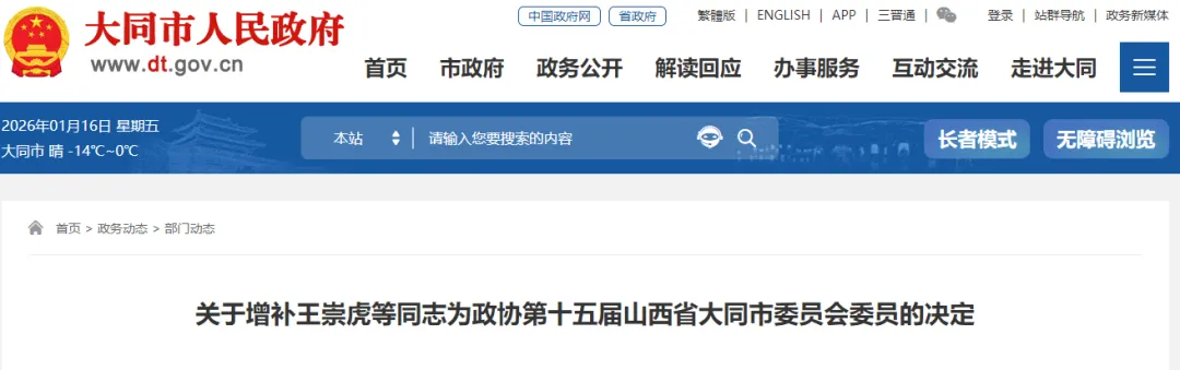 政协第十五届山西省大同市委员会常务委员会第二十一次会议决定:增补王崇虎、边文斌、师鹏文、杜宏辉、张建国5名同志为政协第十五届山西省大同市委员会委员。