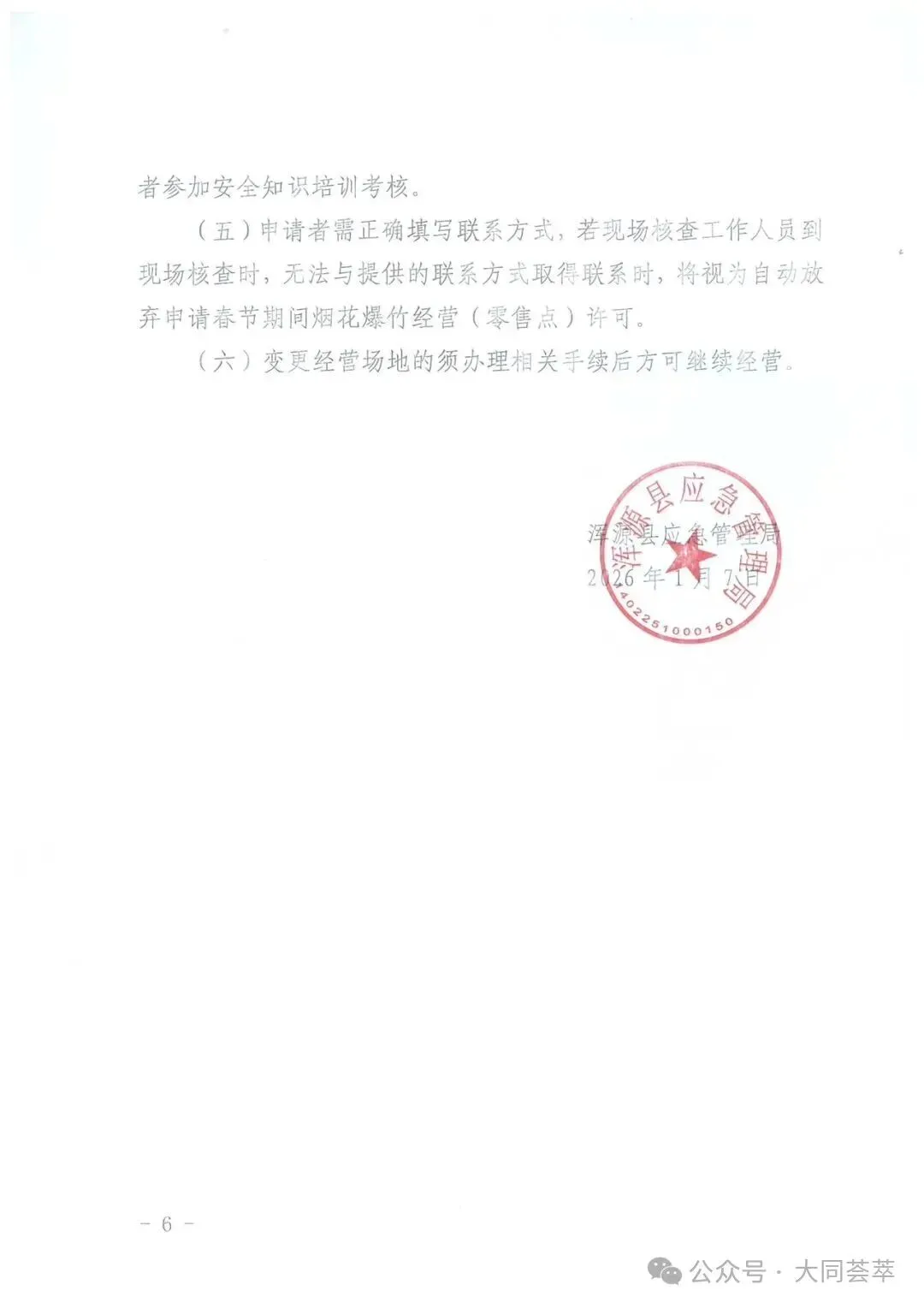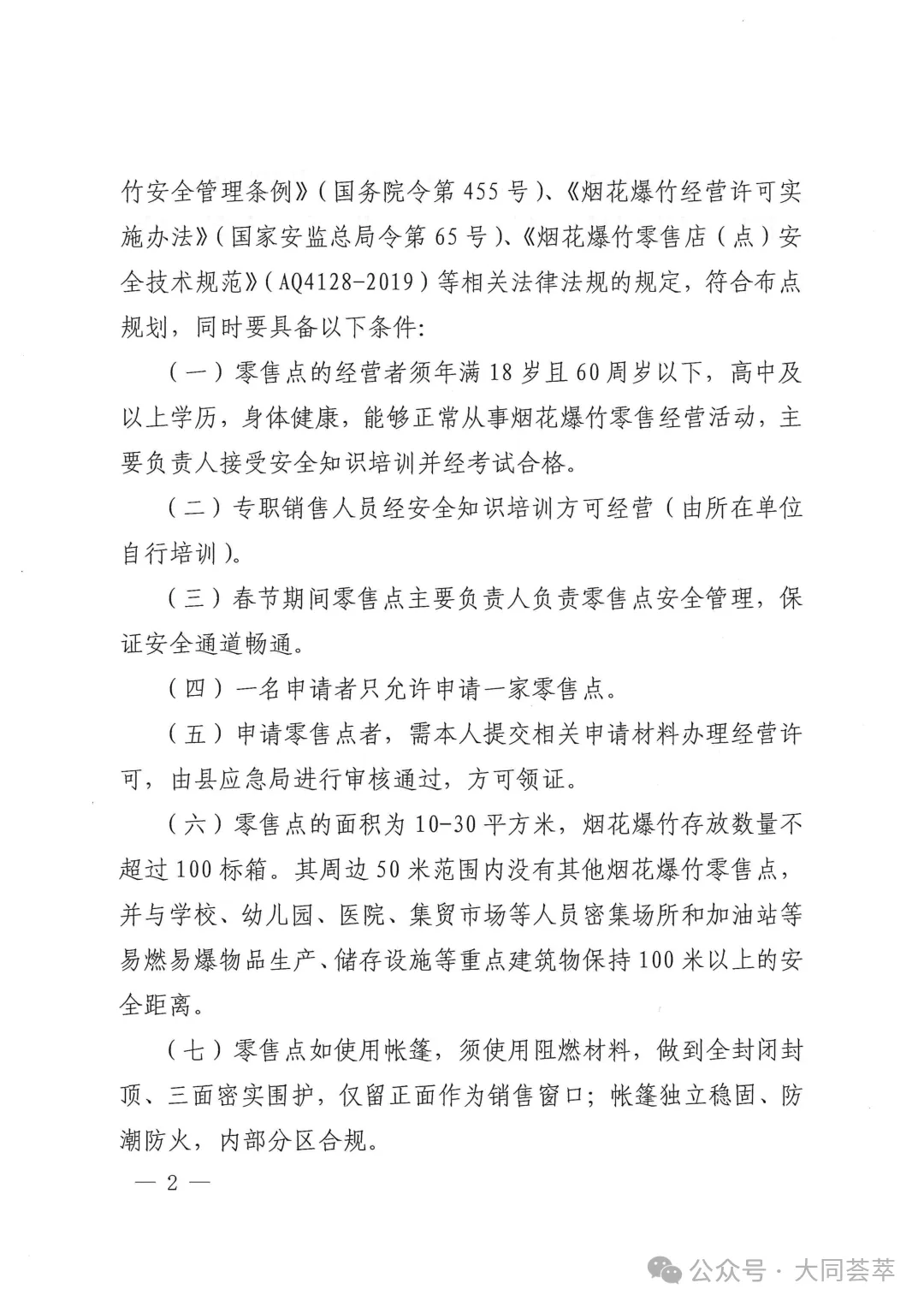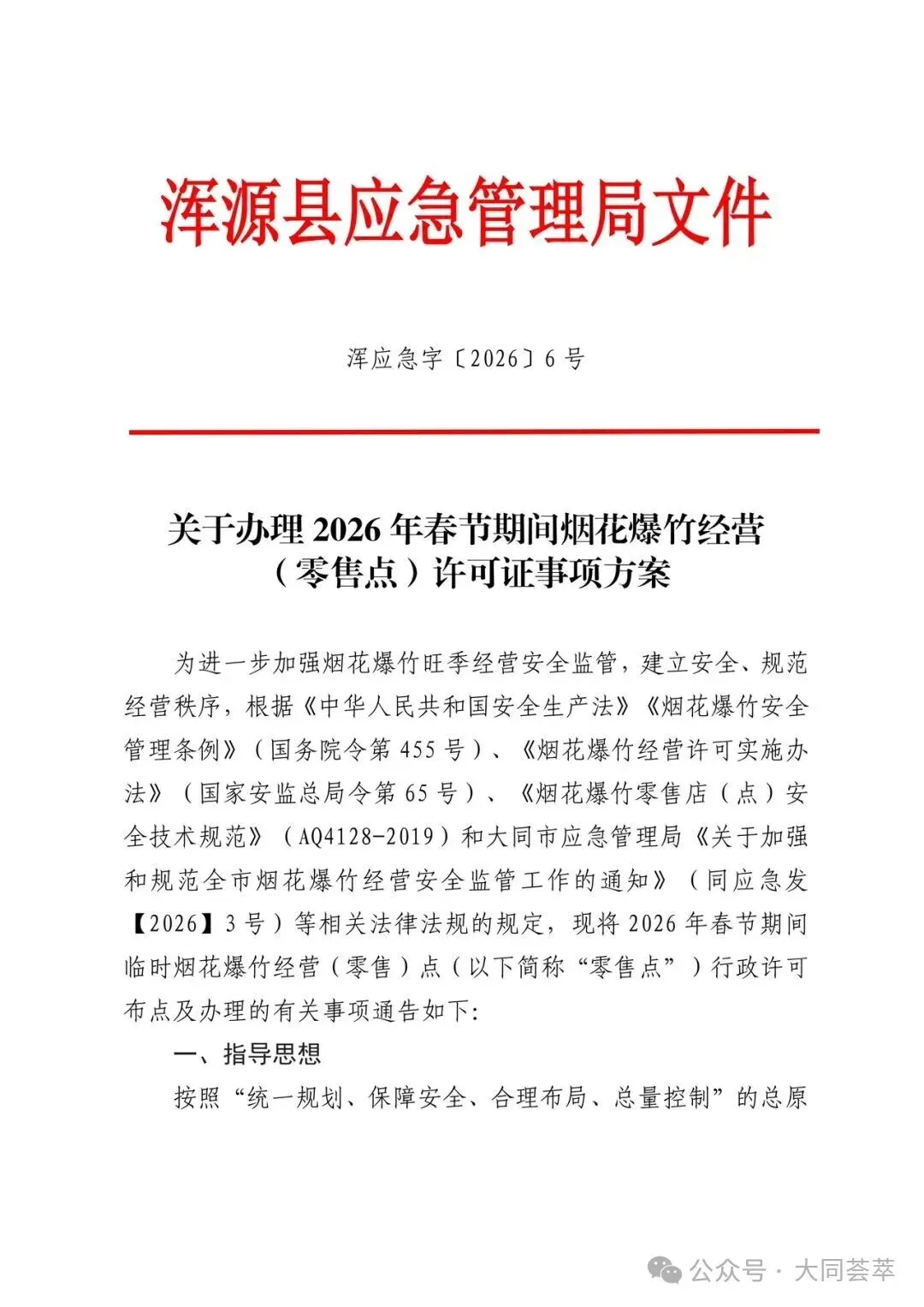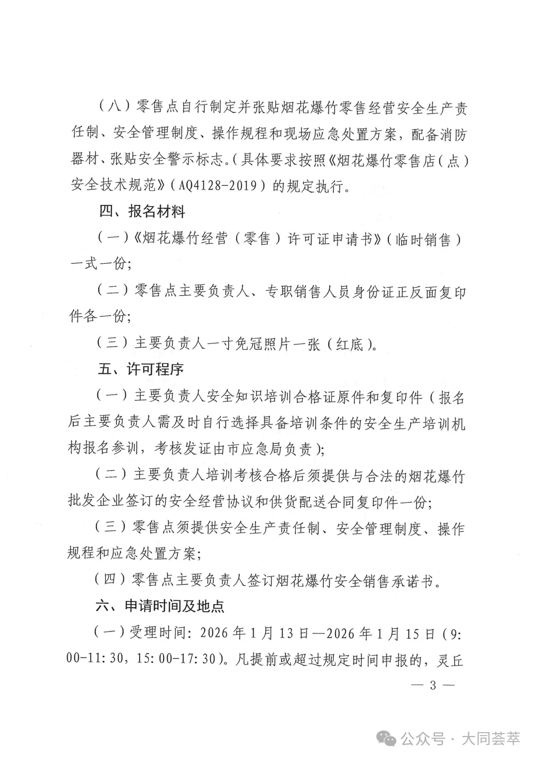 依据《中华人民共和国安全生产法》《烟花爆竹安全管理条例》(国务院令第455号)、《烟花爆竹经营许可实施办法》(应急管理部令第13号)、《山西省安全生产委员会办公室关于做好烟花爆竹生产、经营、储存、运输、燃放等工作的通知》(晋安办发〔2025〕89号)、《山西省应急管理厅关于做好全省烟花爆竹经营安全监督管理工作的通知》(晋应急发〔2025〕312号)、《大同市安全生产委员会办公室关于做好烟花爆竹生产、经营、储存、运输、燃放等工作的意见》(同安办发〔2025〕72号)、《大同市应急管理局关于加强和规范全区烟花爆竹经营安全监管工作的通知》(同应急发〔2026〕3号)文件精神,结合我区实际情况,现就全区烟花爆竹经营(零售)许可证办理工作有关事宜通告如下: 1.符合我区制定的零售经营布点规划;