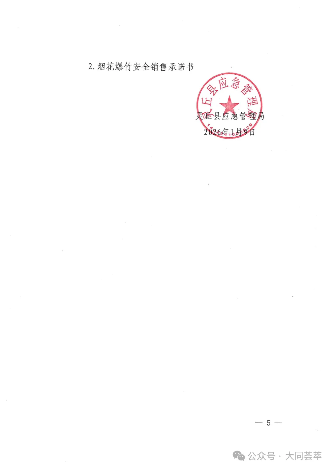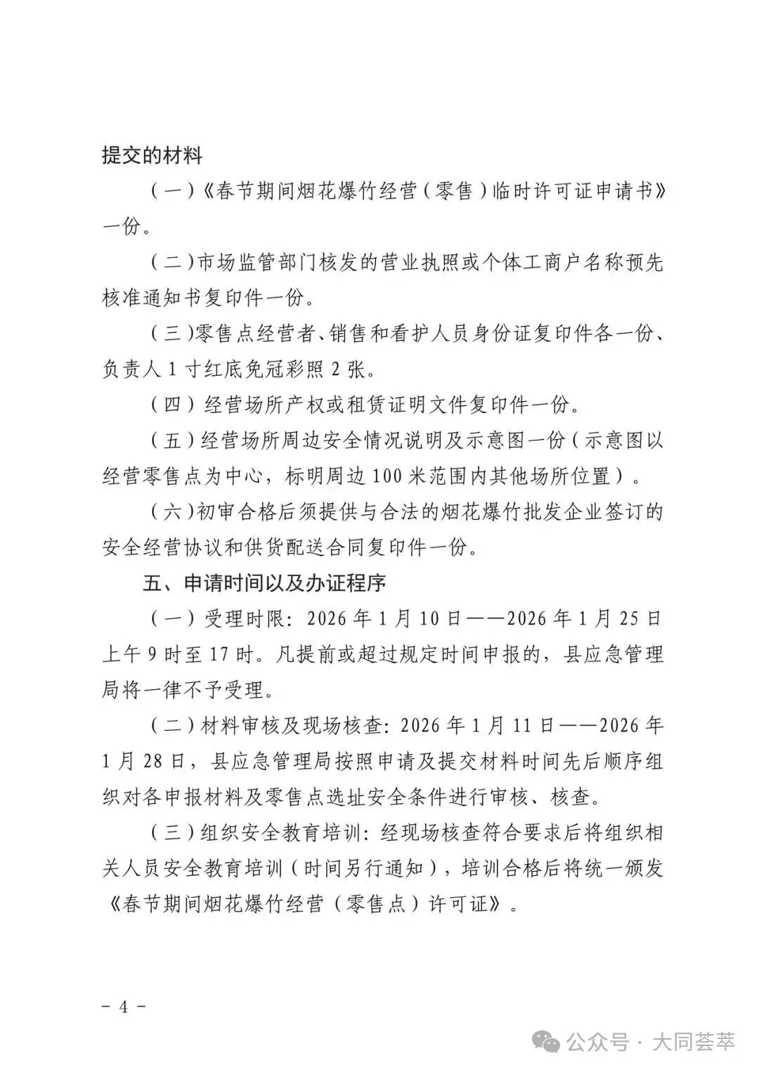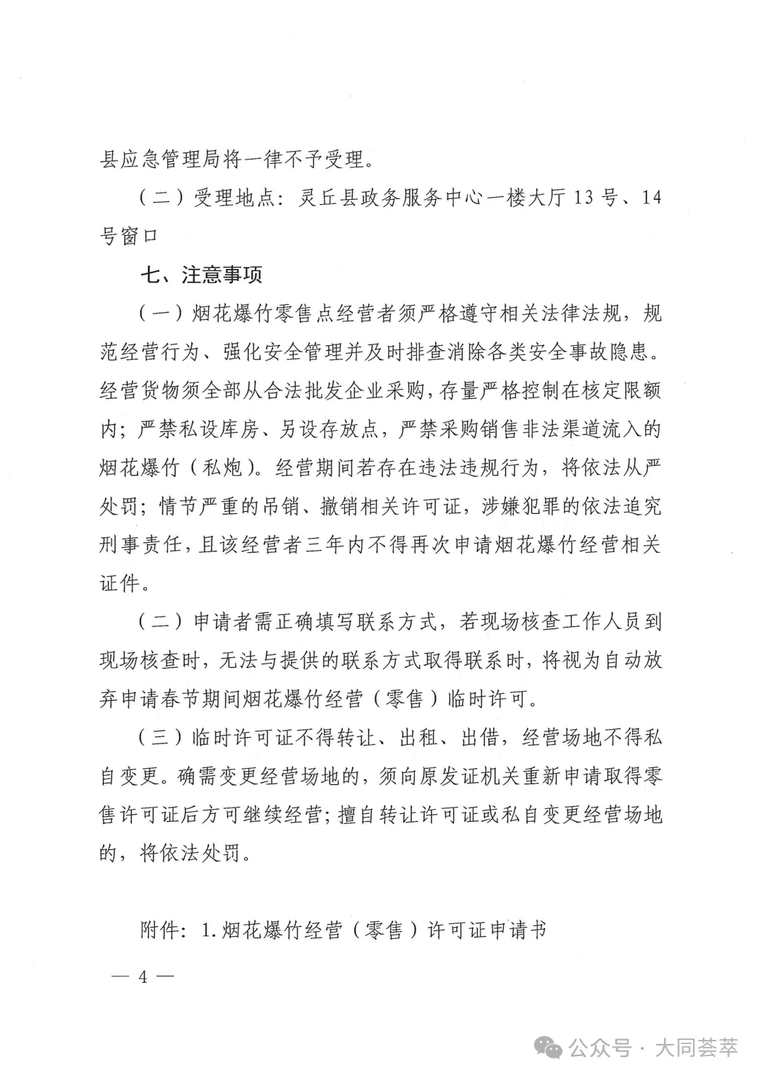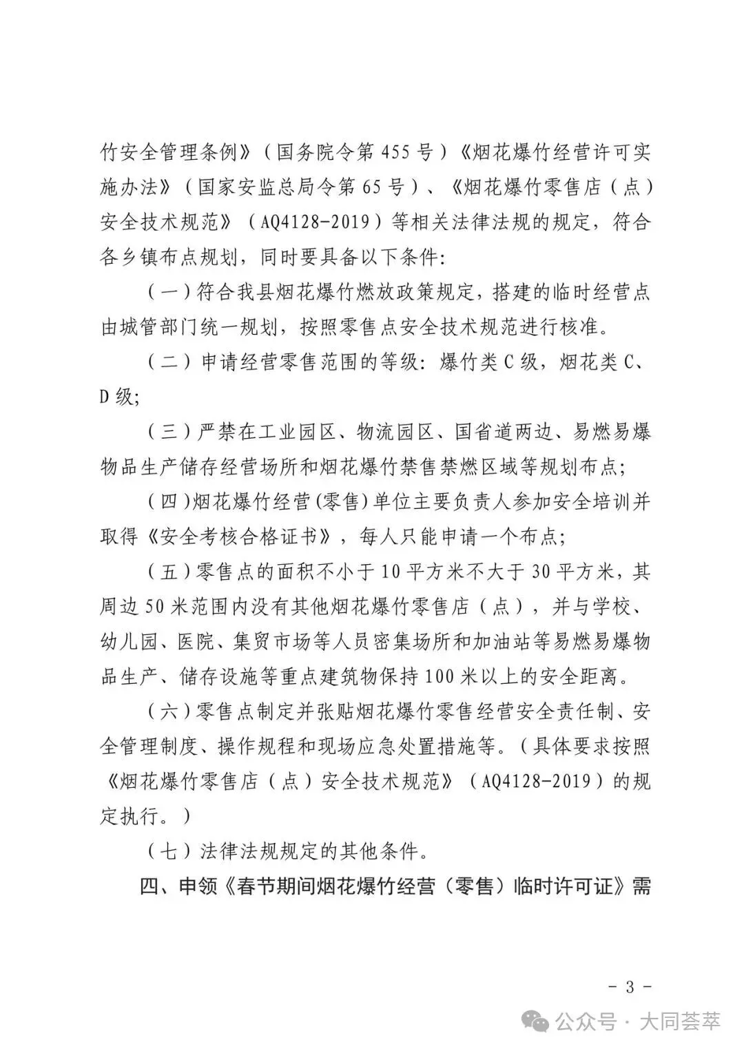 依据《中华人民共和国安全生产法》《烟花爆竹安全管理条例》(国务院令第455号)、《烟花爆竹经营许可实施办法》(应急管理部令第13号)、《山西省安全生产委员会办公室关于做好烟花爆竹生产、经营、储存、运输、燃放等工作的通知》(晋安办发〔2025〕89号)、《山西省应急管理厅关于做好全省烟花爆竹经营安全监督管理工作的通知》(晋应急发〔2025〕312号)、《大同市安全生产委员会办公室关于做好烟花爆竹生产、经营、储存、运输、燃放等工作的意见》(同安办发〔2025〕72号)、《大同市应急管理局关于加强和规范全区烟花爆竹经营安全监管工作的通知》(同应急发〔2026〕3号)文件精神,结合我区实际情况,现就全区烟花爆竹经营(零售)许可证办理工作有关事宜通告如下: 1.符合我区制定的零售经营布点规划;