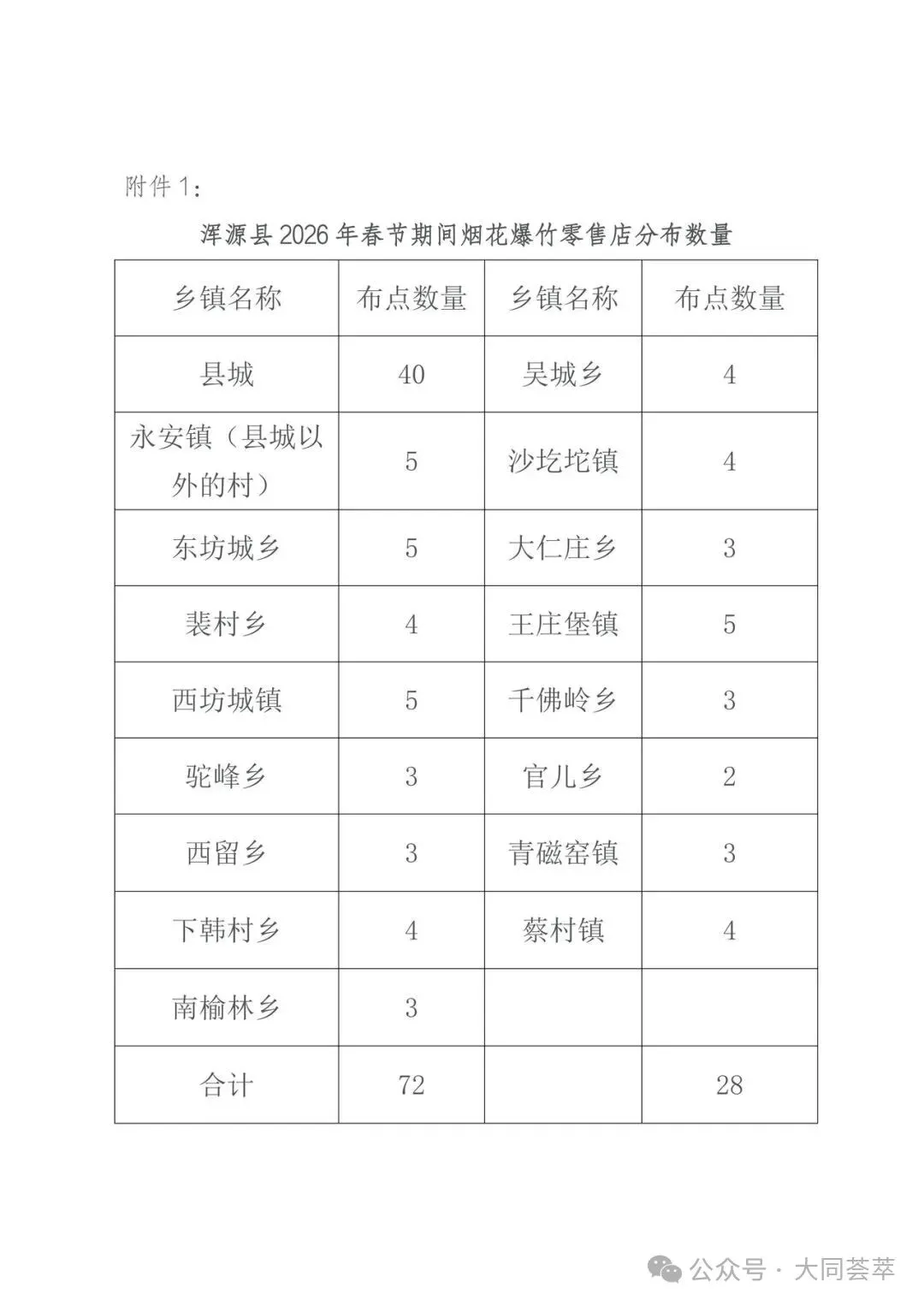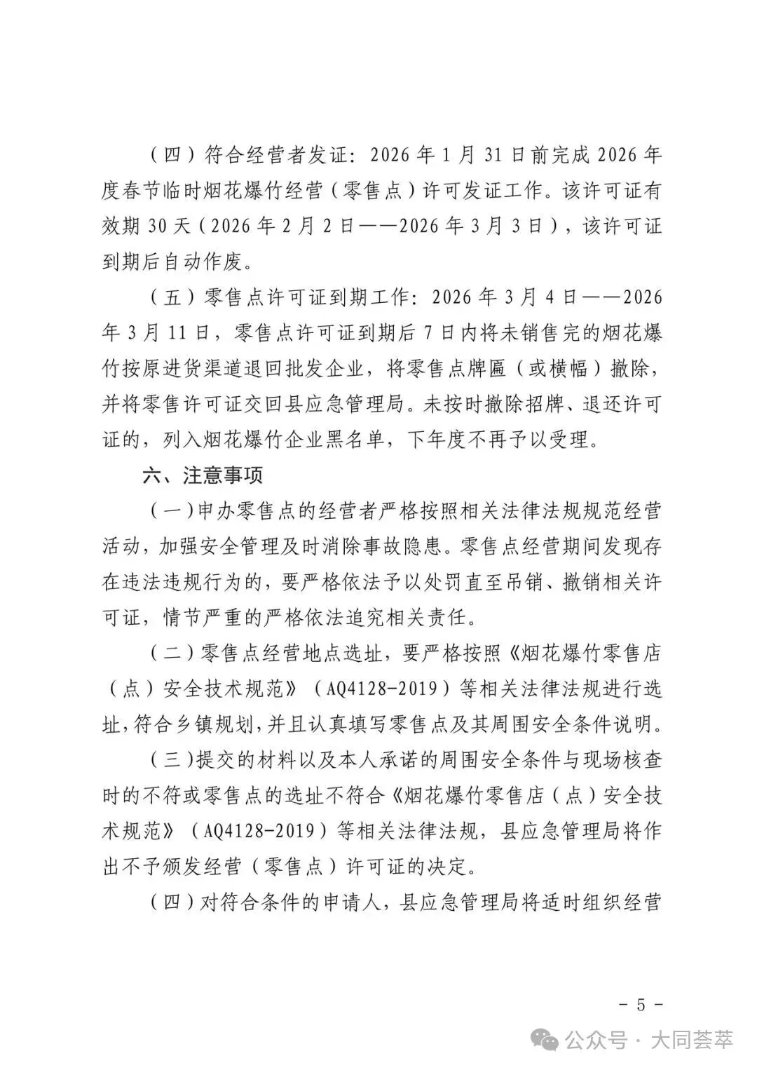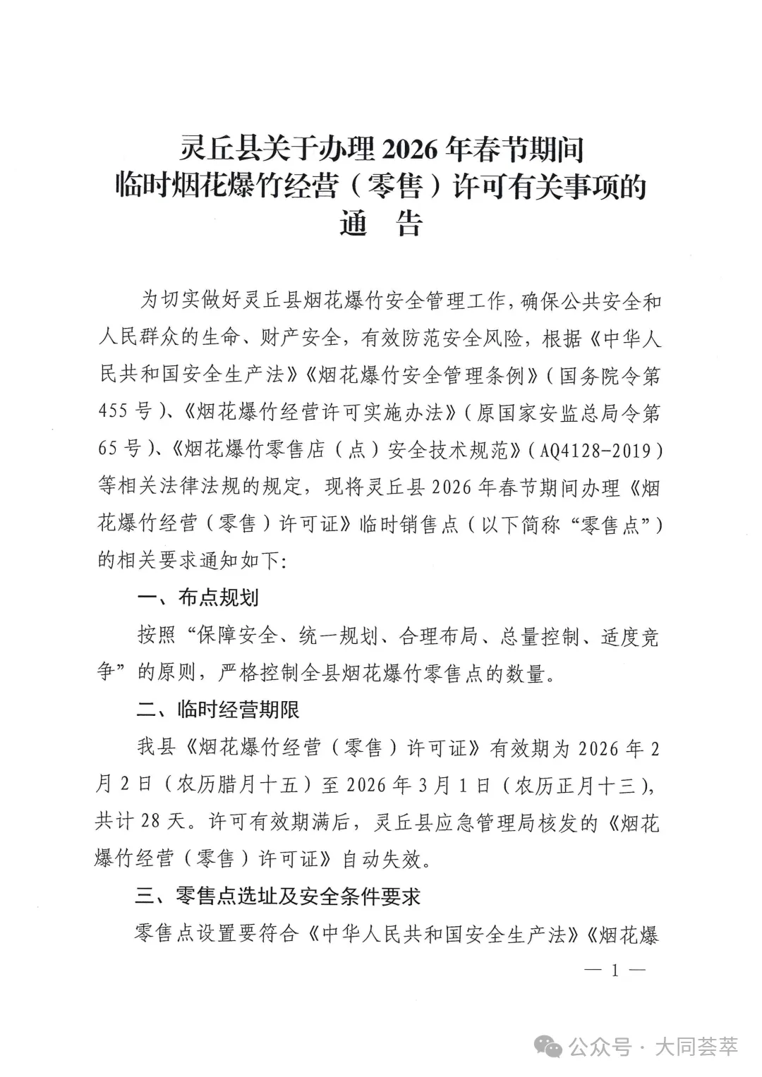 为进一步加强烟花爆竹经营安全监管,规范市场秩序,根据《中华人民共和国安全生产法》《烟花爆竹安全管理条例》(国务院令第455号)、《烟花爆竹经营许可实施办法》(国家安监总局令第65号)、《山西省应急管理厅关于做好烟花爆竹经营安全监督管理工作的通知》(晋应急发〔2025〕312号)、《大同市安全生产委员会办公室关于做好烟花爆竹生产、经营、储存、运输、燃放等工作的意见》(同安办发〔2025〕72号)、《烟花爆竹零售店(点)安全技术规范》(AQ4128-2019)等相关法律法规、行业标准规定,现将有关事项通告如下: