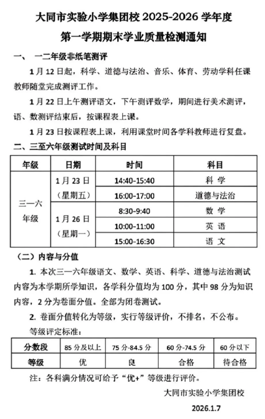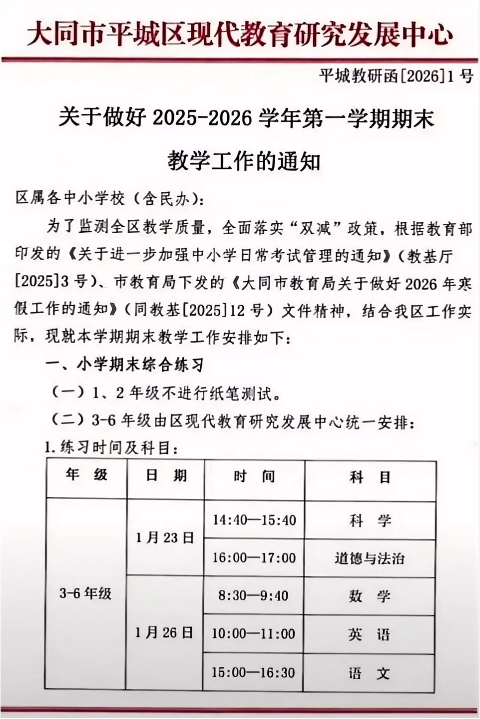 为了监测全区教学质量,全面落实“双减”政策,根据教育部印发的《关于进一步加强中小学日常考试管理的通知》(教基厅[2025]3号)、市教育局下发的《大同市教育局关于做好2026年寒假工作的通知》(同教基[2025]12号)文件精神,结合我区工作实际,现就本学期期末教学工作安排如下: