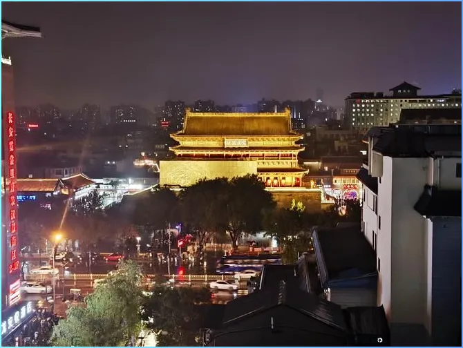 傍晚的鼓楼,灯一亮,整个广场都活了。有人在跳广场舞,有人在卖玩具,小孩在石台阶上跑来跑去。音箱的声音和人声混在一起,不吵,像一层暖色调的背景音铺在空气里,让人觉得热闹但不烦躁。天色慢慢暗下来,路灯亮起,光打在青石板上,像一层浅金色的碎片在地上晃。站在鼓楼下,抬头能看见城楼的轮廓,黑色的剪影衬着暗蓝色的天空,城市像被一层淡蓝色的滤镜包住,有点梦幻,但又很真实。