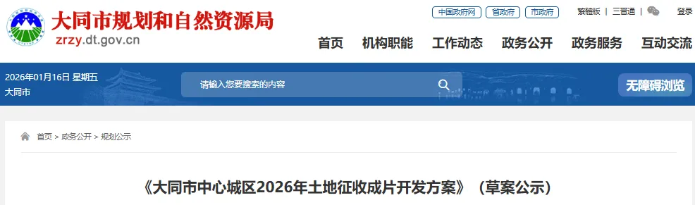 为促进大同市中心城区经济社会高质量发展,保障建设用地供给,保护被征收人的合法权益,规范大同市中心城区土地征收成片开发行为,依法推进农村集体所有土地征收工作,切实维护被征地农村集体和农民利益,大同市人民政府编制了《大同市中心城区2026年土地征收成片开发方案》(以下简称《方案》)。现将方案主要内容公示如下: