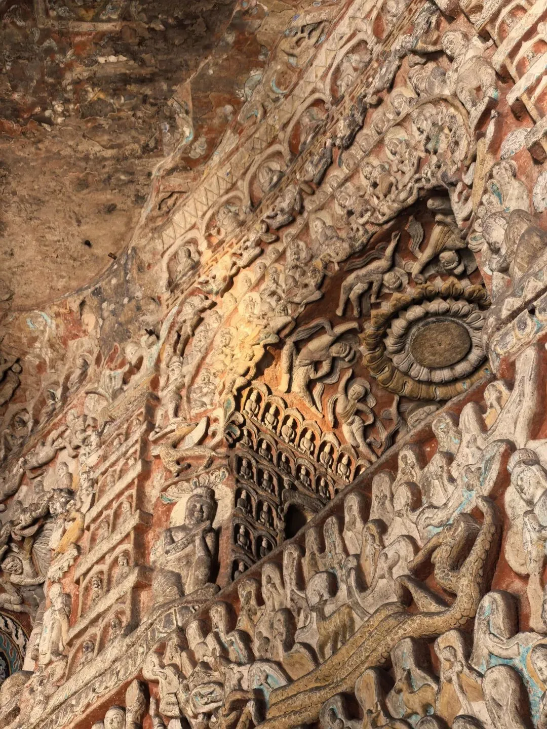 顺着洞窟朝前,听导游讲解来历、渊源。脑中满是拓跋鲜卑和北魏的历史轨迹。随手拍了一些觉得精美的部分。