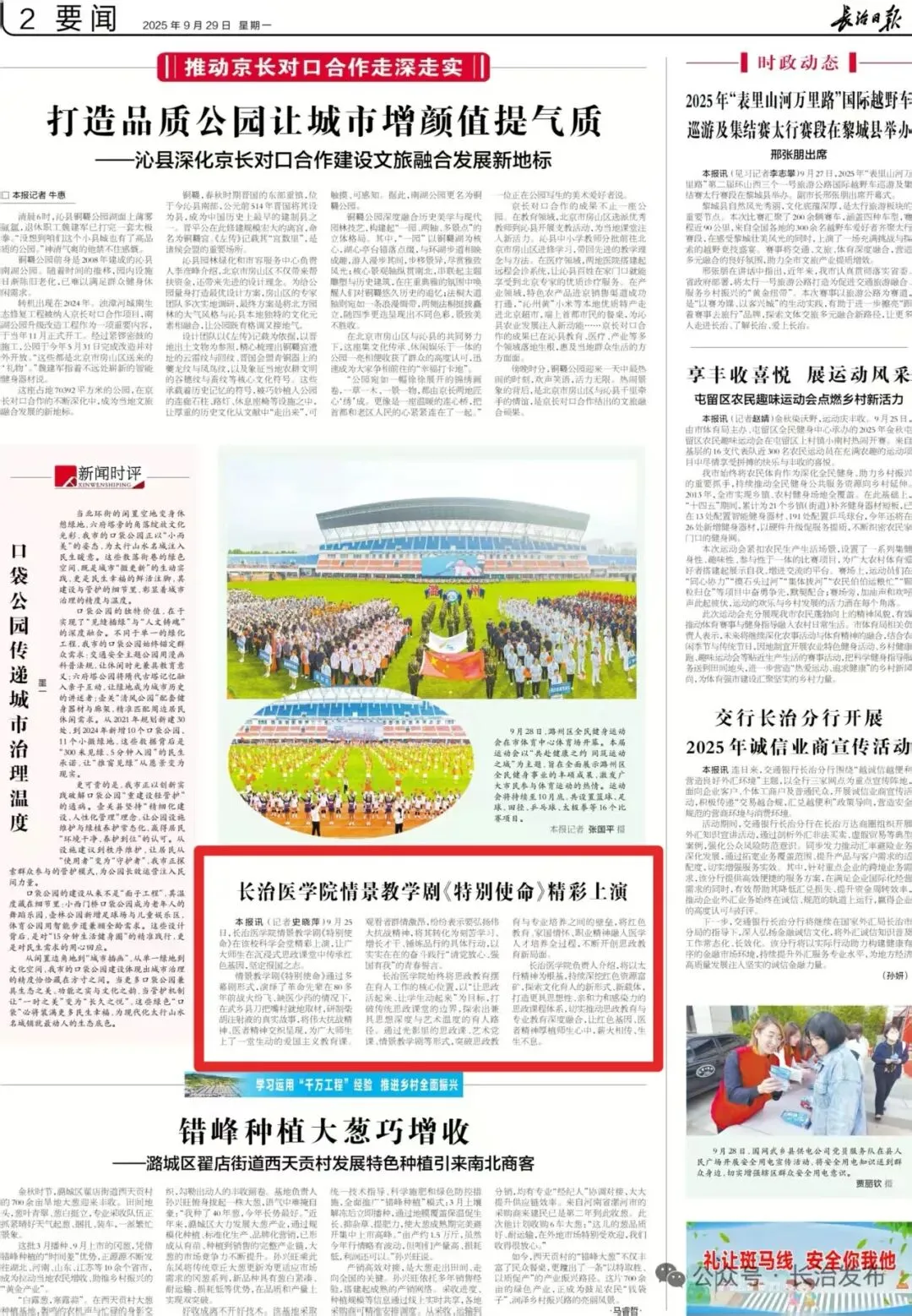 近日,长治新闻、《长治日报》等市级主流媒体相继对长治医学院创新思政教育模式、深化育人工作的系列实践进行专题报道,集中关注学校以“光影里的思政课”“艺术党课《长城·黄河·太行》”“情景教学剧《特别使命》”为代表的特色育人载体,生动展现了长治医学院构建“大思政”工作格局、推动思政教育与专业教育深度融合的积极探索,为高校落实立德树人根本任务提供了“长医样本”。