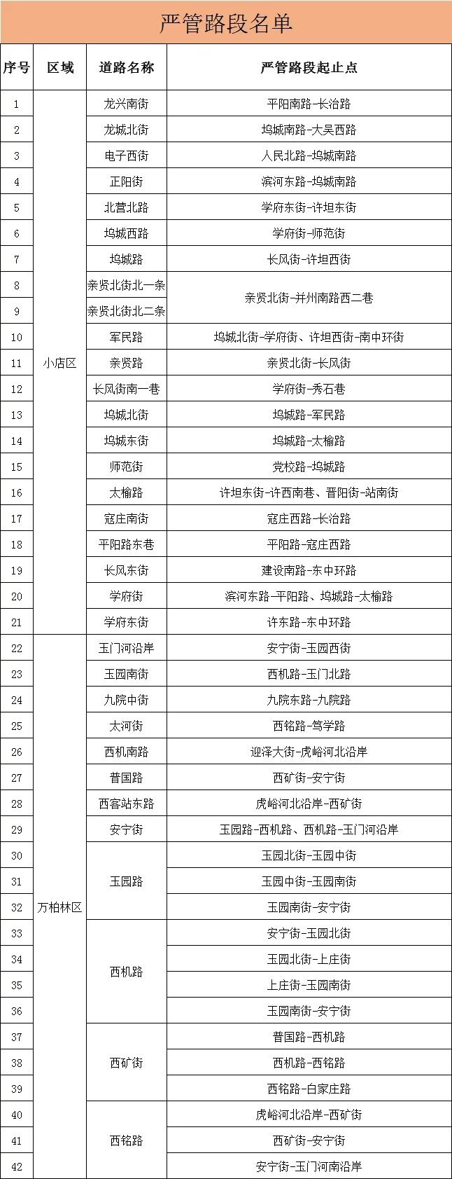 为改善城市道路交通环境,规范停车秩序,提高道路通行效率,结合目前市区停车现状和群众反映较为突出的停车乱点,根据《中华人民共和国道路交通安全法》《中华人民共和国道路交通安全法实施条例》《山西省实施〈中华人民共和国道路交通安全法〉办法》及相关规程,公安机关交通管理部门经过综合研判和认真梳理,决定将下列道路新增为严格管理道路(简称“严管道路”),具体事项公布如下: