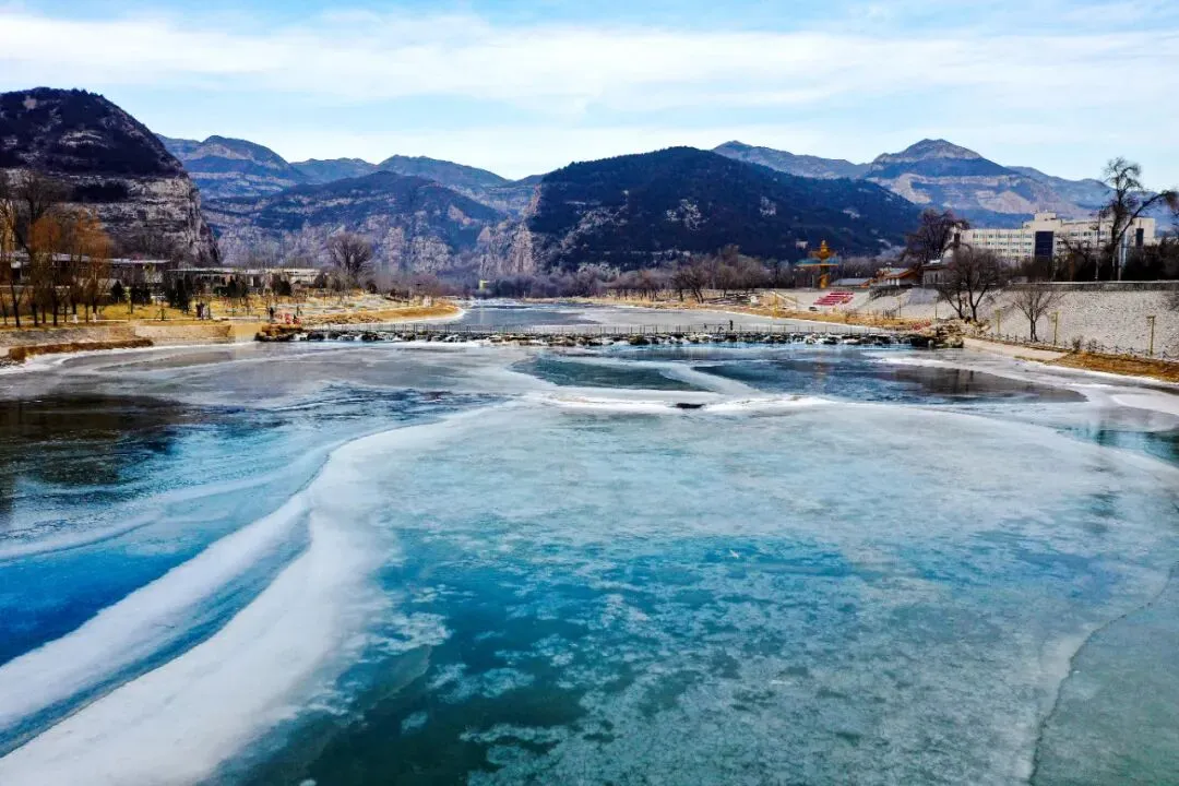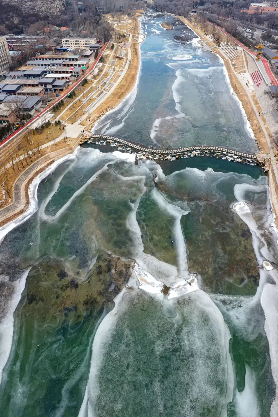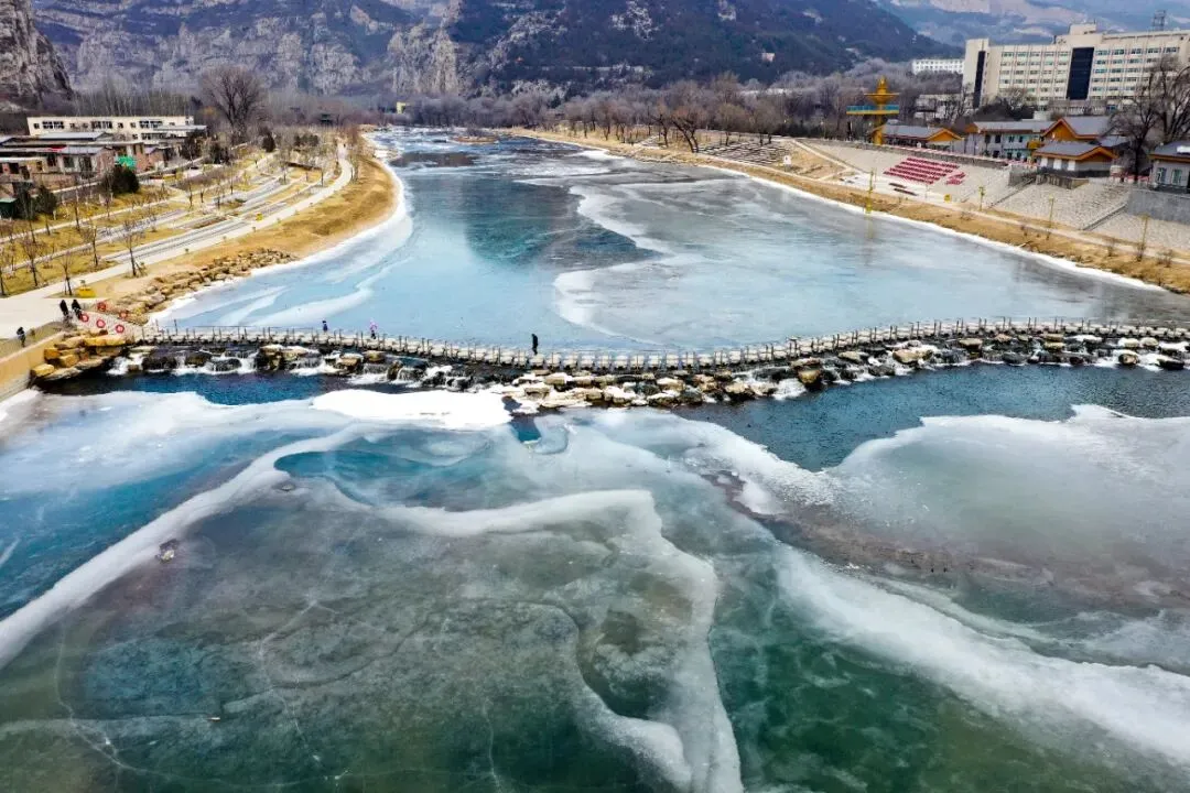 1月15日,老龙头景区内,晶莹剔透的冰花在汾河河面上伸展,形成美丽图画。牛利敏摄#太原老龙头景区#