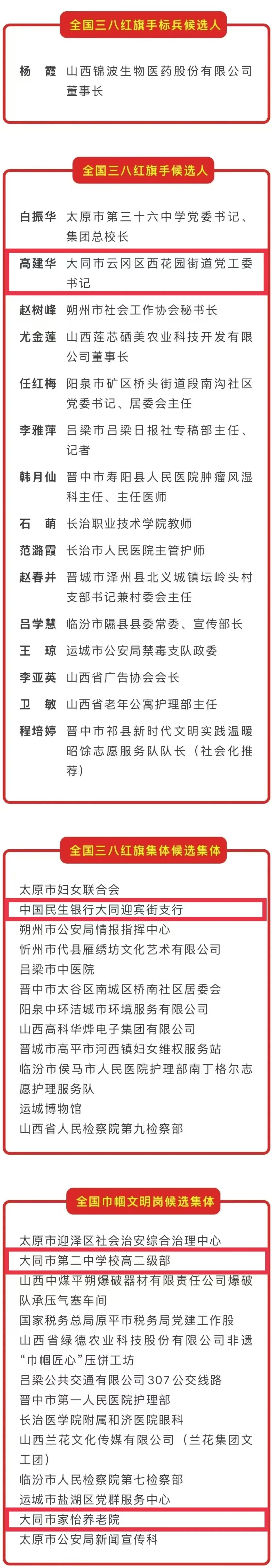 根据《全国妇联办公厅关于开展2025年度全国三八红旗手标兵、全国三八红旗手、全国三八红旗集体、全国巾帼文明岗评选活动的通知》(妇厅字〔2025〕34号),省妇联按有关程序组织开展了评审推荐工作,拟推荐杨霞为全国三八红旗手标兵候选人,白振华等15人为全国三八红旗手候选人,太原市妇女联合会等12个集体为全国三八红旗集体候选集体,太原市迎泽区社会治安综合治理中心等13个集体为全国巾帼文明岗候选集体。