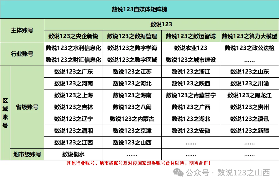 “数说123之山西”是北京数说政通科技有限公司旗下自媒体矩阵“数说123”子账号,依托数据、情报、自媒体、资源为省、市、县三级数政局、运营商、国有数智平台公司、系统集成公司提供招投标数据定制、商机捕获、市场洞察、行业对标、生态与渠道建设、解决方案提供、自媒体宣传与账号运营等专业服务。
