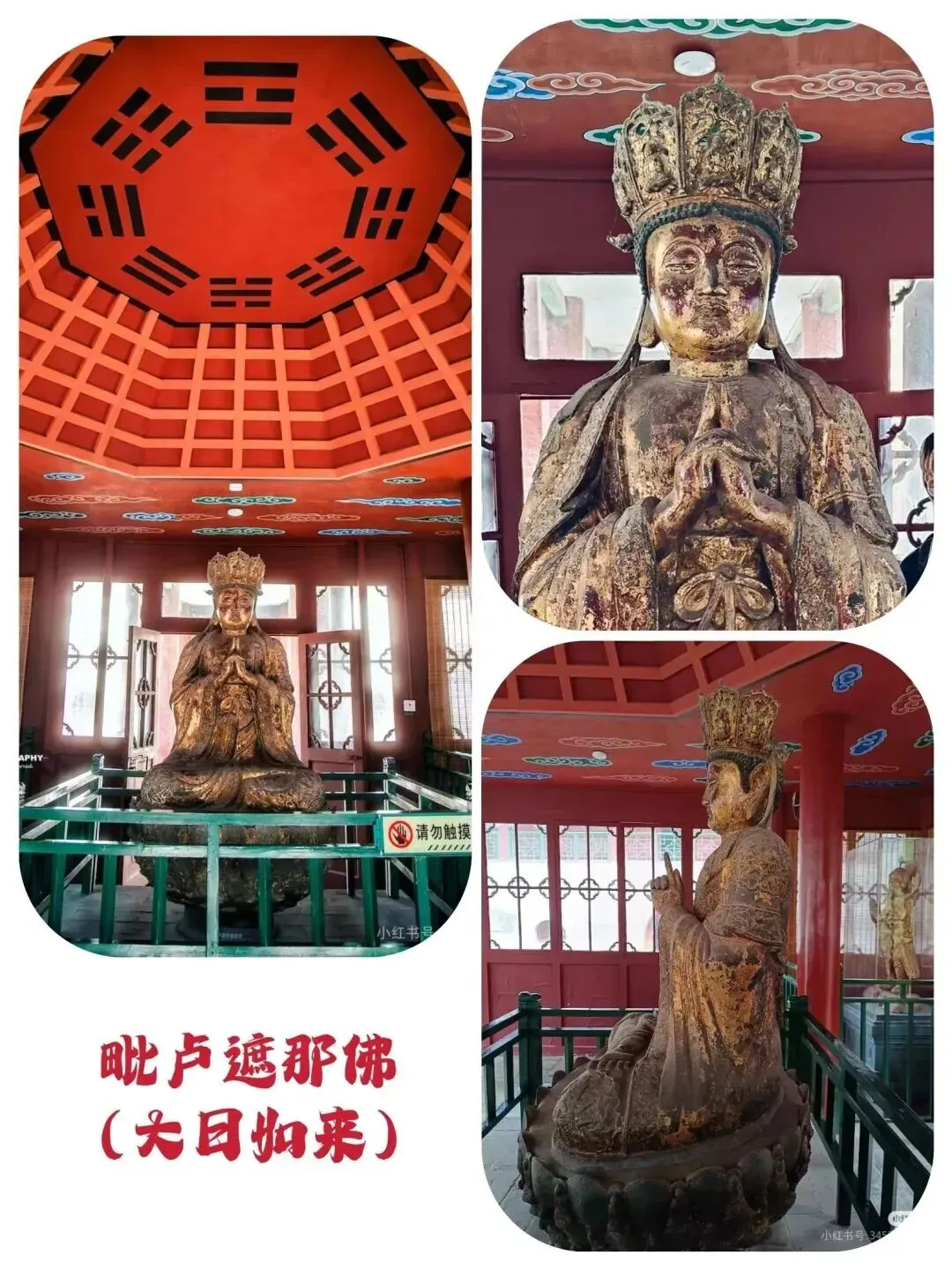 八卦院中间方形三间两层亭里,是一尊明代铜质鎏金毗卢遮那佛像,庄严肃穆,自带一股神圣不可侵犯的气场,让人望之便心生敬畏。