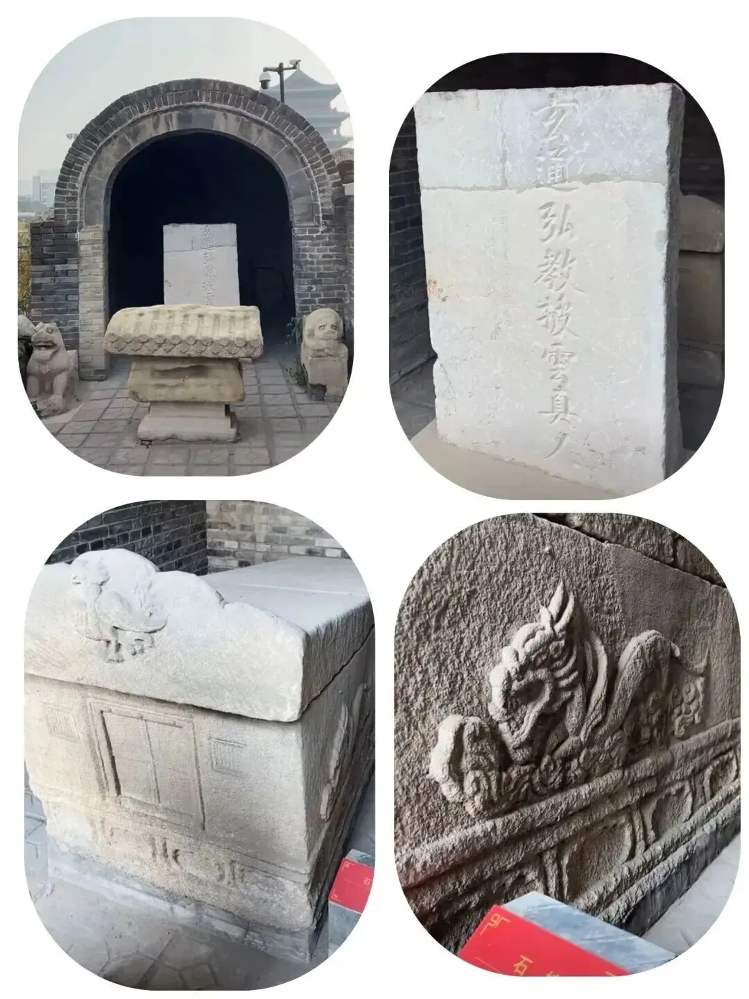 大院东侧有座假山,山上满是太湖石。沿着石头路往山上走,便能瞧见各个时代的经幢错落其间。走着走着,一个石棺赫然入目,上头清晰地刻着“玄通弘教披云真人”字样,石棺四面,青龙、白虎、朱雀、玄武四神兽威风凛凛,仿若在守护着什么。
