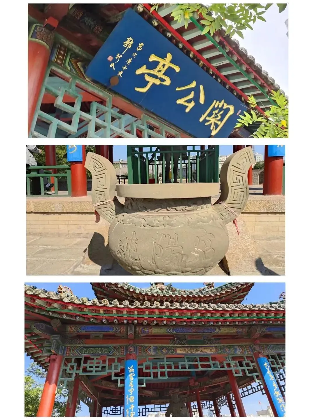 亭内立着一尊明代铜制关羽骑马像,关公胯下赤兔马,手提青龙偃月刀,昂首挺胸,威风凛凛。这关公像和常见的不太一样,脸上没了标志性的美髯,这就是纯阳宫的“两奇”中的第二奇“关公为什么没胡子?”有人猜,这是关公年轻时的模样;也有人说,原本有胡须,只是年头太久,不小心遗失了。不过,我倾向于后者,你看关公右手的姿势,明明就是在捋胡子呢!