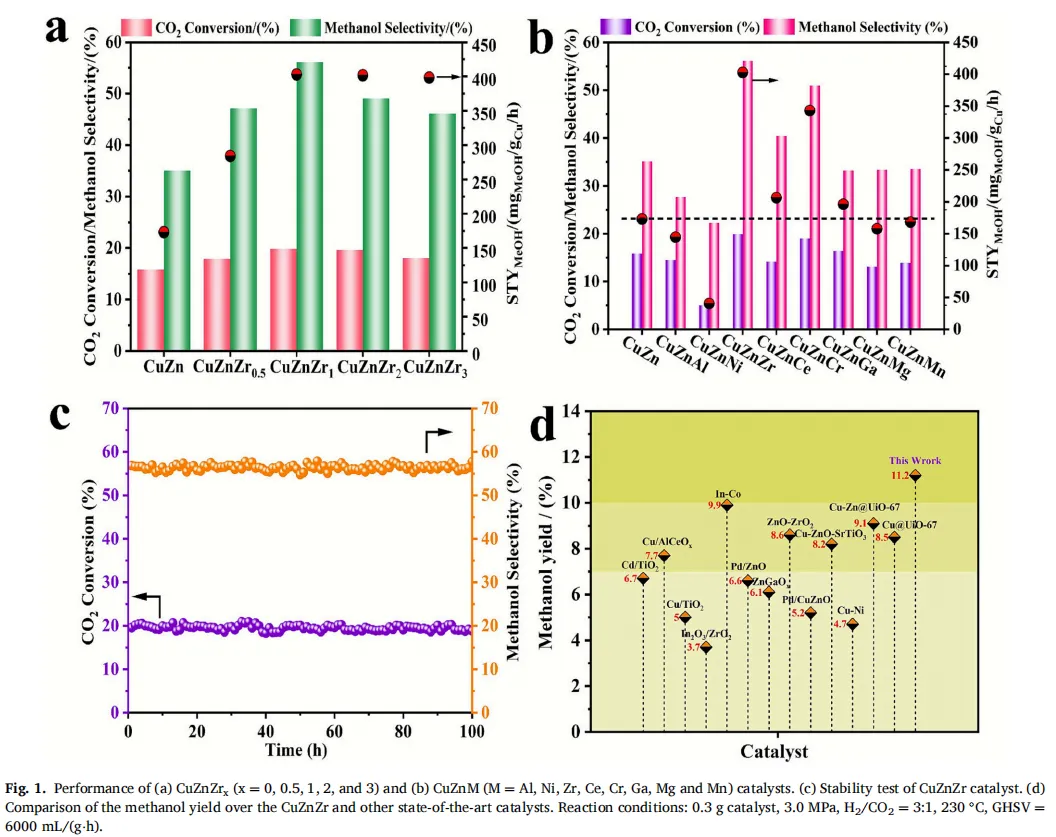 4. 优化的CuZnZr₁催化剂甲醇时空产率达402.83 mg_(MeOH)·g_Cu(-1)·h(-1),是CuZn催化剂的2.3倍,且稳定性优异。