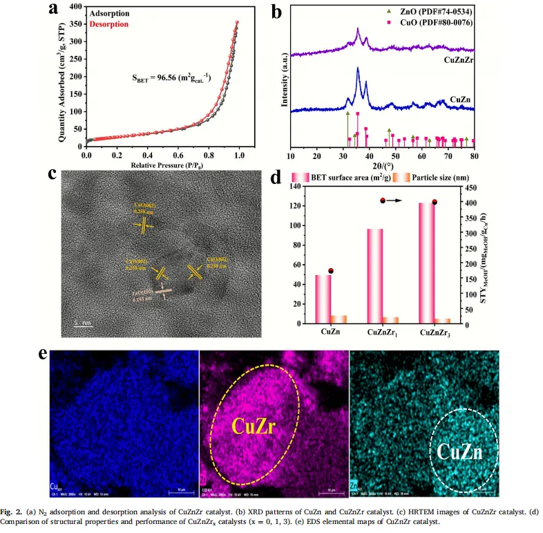 ICP分析证实Zr掺杂量与理论值一致,N₂吸附-脱附结果显示CuZnZr的比表面积(96.56 m²/g)远高于纯CuZn(49.19 m²/g)(图2a)。XRD图谱(图2b)仅检测到CuO和ZnO的衍射峰,未发现ZrO₂峰,说明Zr高度分散;Scherrer方程计算得CuZnZr的CuO粒径(6.6 nm)小于纯CuZn(8.3 nm),HRTEM图像(图2c)也验证了这一结果,且未改变活性晶面暴露。EDSmapping(图2e)显示Zr与Cu优先共存,形成CuZr界面,而Zn分布相对独立。但结构优化(比表面积、粒径)趋势与催化性能不完全一致(图2d),说明结构分散不是催化活性提升的主要原因。