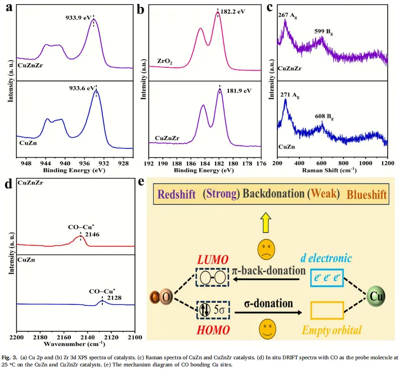 XPS分析显示,CuZnZr中Cu 2p₃/₂结合能(933.9 eV)高于纯CuZn(933.6 eV),Zr 3d结合能(181.9 eV)低于纯ZrO₂(182.2 eV)(图3a、b),证明Cu向Zr发生电子转移。Raman光谱中(图3c),CuZn的Cu-O振动峰 redshift,说明Cu电子密度降低。原位DRIFTS测试(图3d)中,CuZnZr的CO吸附峰(2146 cm⁻¹)比纯CuZn(2128 cm⁻¹)蓝移,印证Cu电子缺失,无法有效向CO反馈电子(图3e)。且Zn的电子状态未受Zr影响,说明电子相互作用仅发生在Cu和Zr之间。