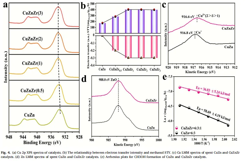 1.明确CuZnZr催化剂中Cu→Zr的电子转移作用,证实电子效应是催化活性提升的核心驱动因素。