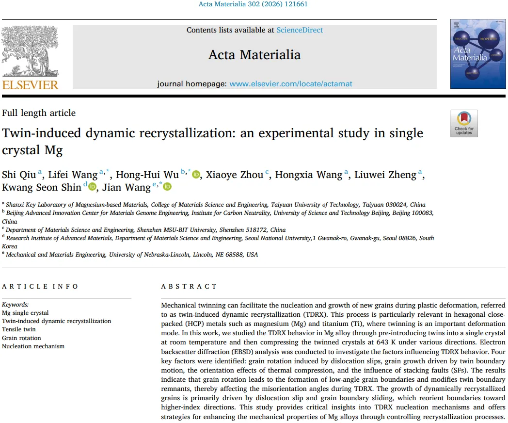 本文聚焦于密排六方(HCP)金属镁(Mg)中一种重要的微观结构演变过程——孪晶诱发动态再结晶(TDRX)。研究首先通过室温压缩在纯镁单晶中预引入不同取向的{10-12}拉伸孪晶,随后在643K(约370°C)的较高温度下,沿不同方向对含有预孪晶的样品进行温压缩变形,旨在揭示TDRX的形核与长大机制。研究者系统运用了电子背散射衍射(EBSD)和透射电子显微镜(TEM)等分析手段,详细表征了变形前后的微观组织演变。结果表明,TDRX过程受到多种因素的综合影响:由位错滑移诱发的晶内旋转、由孪晶界迁移驱动的晶粒长大、热压缩加载方向带来的取向效应,以及堆垛层错(SFs)的影响。晶内旋转导致了小角度晶界(LAGBs)的形成并改变了残余孪晶界的特性,从而影响了再结晶过程中的取向差角。动态再结晶晶粒的生长则主要由位错滑移和晶界滑动驱动,使得晶界取向朝更高指数方向演变。该研究深入剖析了镁合金中TDRX的复杂形核机制,为通过调控再结晶过程优化镁合金的力学性能(如塑性)提供了重要的理论基础和实验依据。