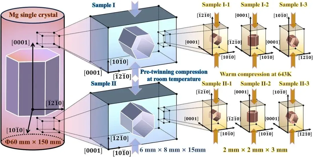 图1: 展示了本研究的样品制备与变形流程示意图。首先从纯镁单晶锭上切割出初始样品,随后在室温下沿<10-10>或<12-10>方向进行预压缩,以引入特定的{10-12}拉伸孪晶变体。接着,从这些预孪晶样品上进一步切割出用于温压缩的小块试样,并沿三个不同的方向([12-10]、[0001]和[10-10])在643K下进行压缩。该图清晰地说明了实验设计的逻辑和多步骤变形路径。