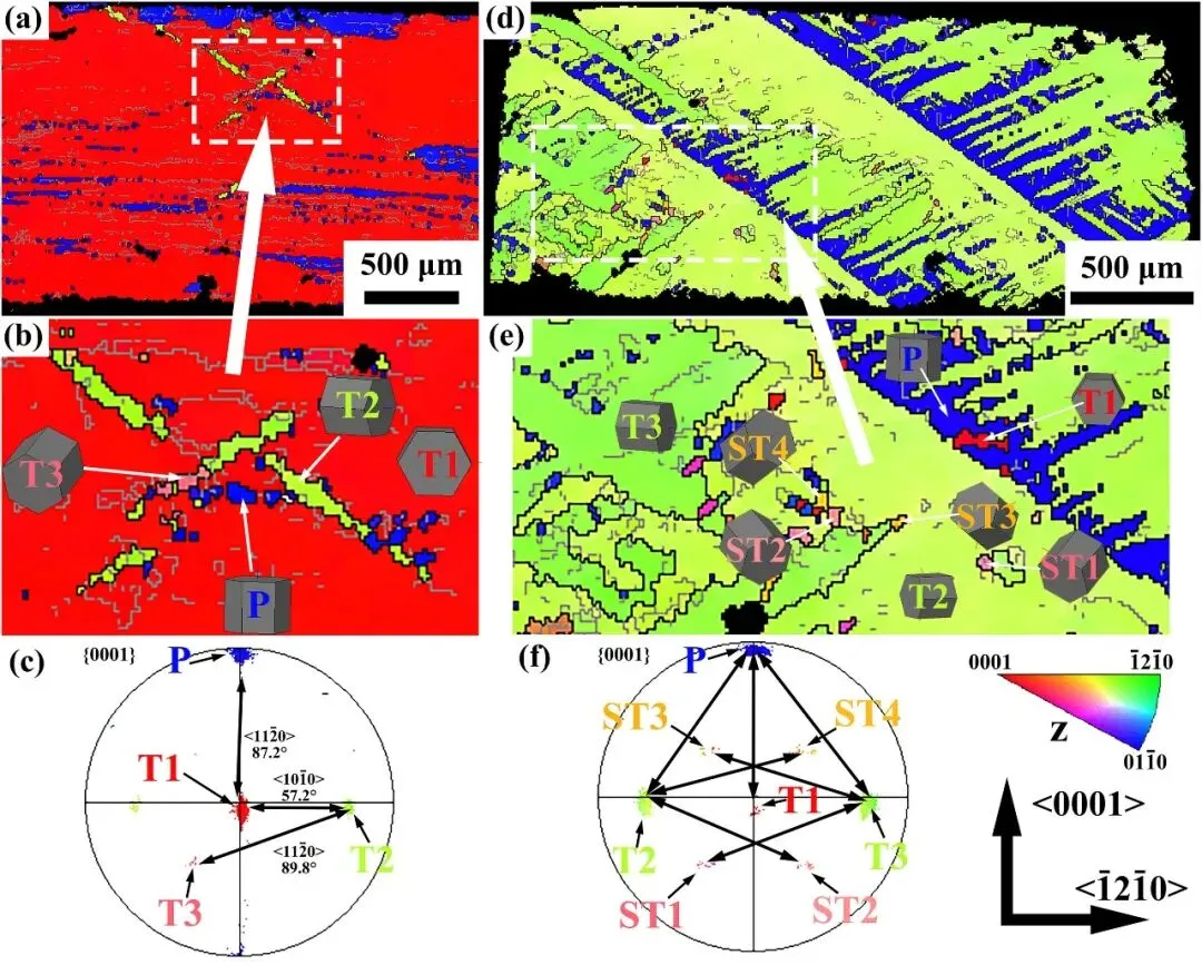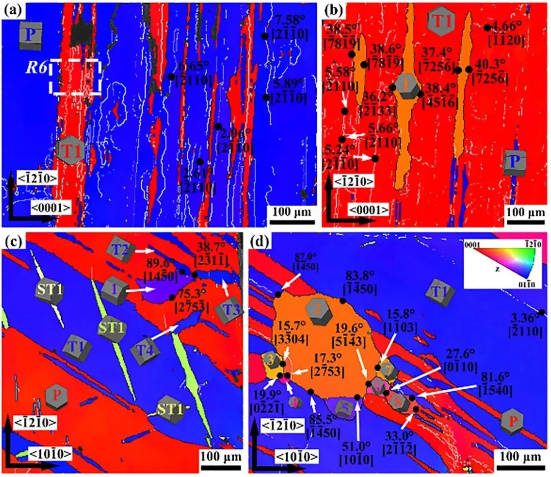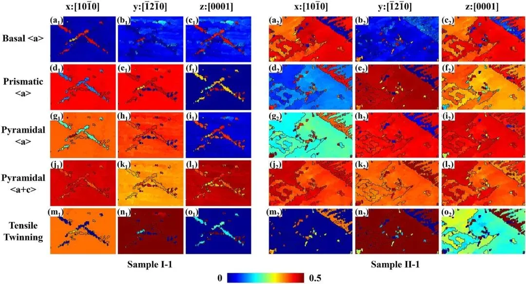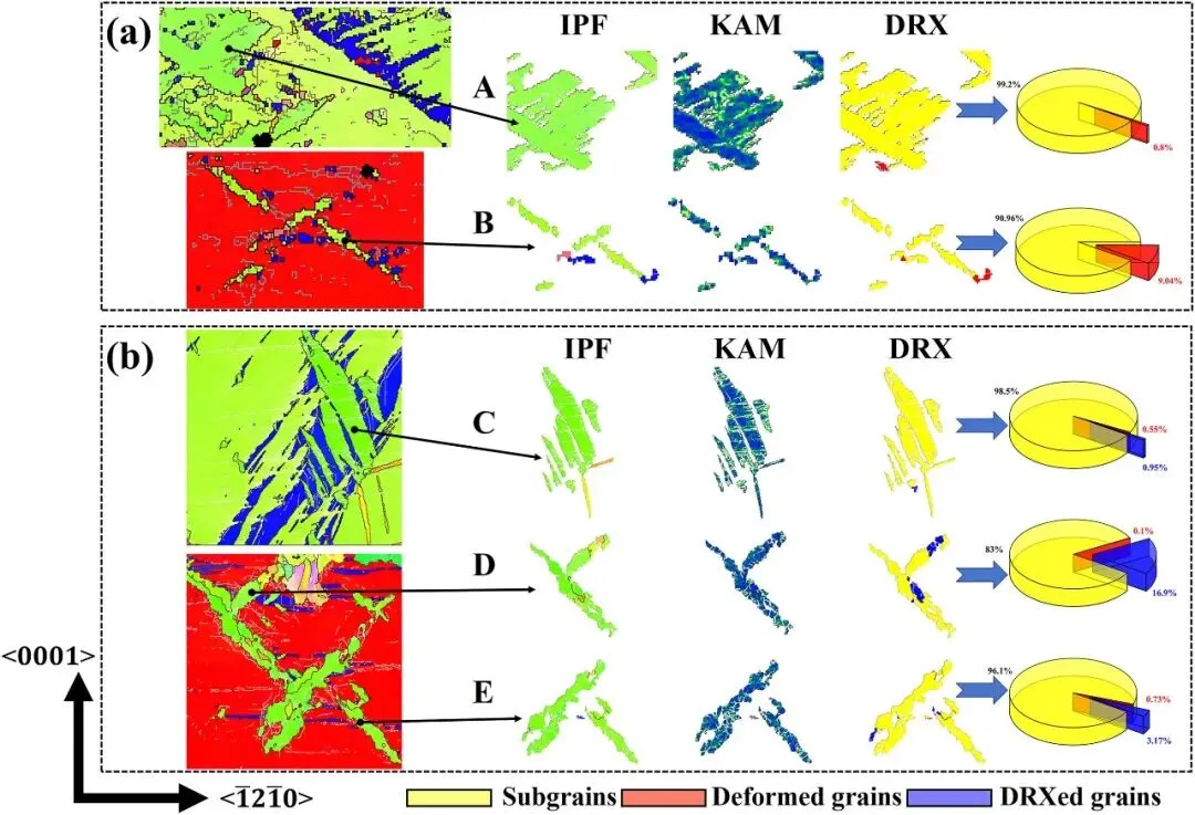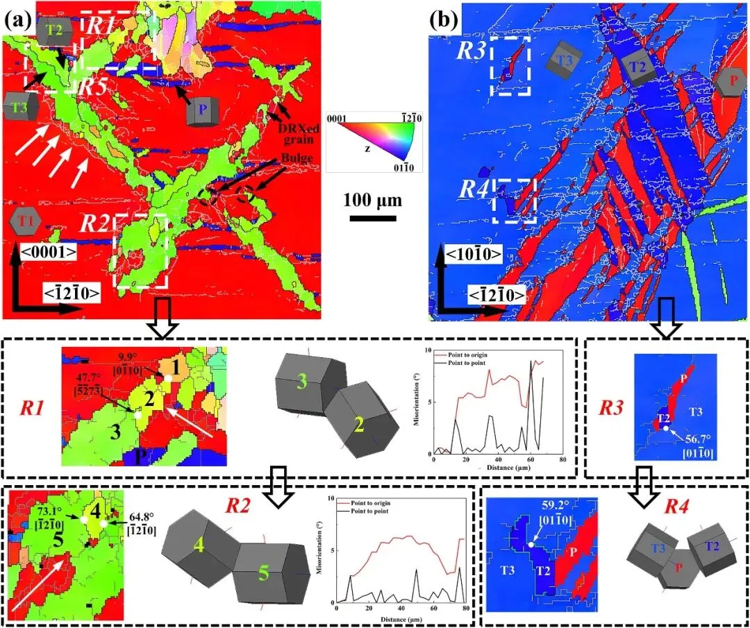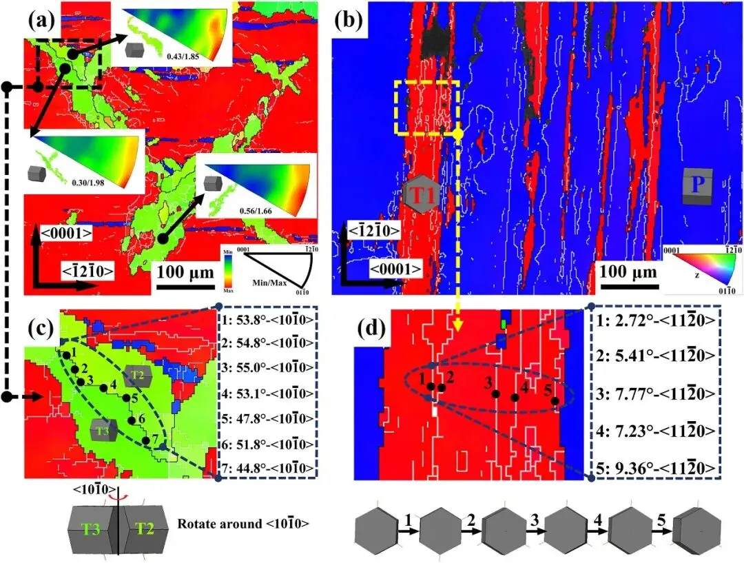 图2: 呈现了温压缩前两个预孪晶样品(I-1和II-1)的EBSD分析结果。图中通过反极图(IPF)和(0001)极图展示了样品的微观组织与取向。可以清晰地观察到大量的{10-12}拉伸孪晶(图中以红色、蓝色等不同颜色区域表示),以及由孪晶-孪晶相互作用形成的次级孪晶。不同压缩方向导致了不同孪晶变体的激活,这为后续研究不同孪晶变体在TDRX中的行为差异奠定了基础。